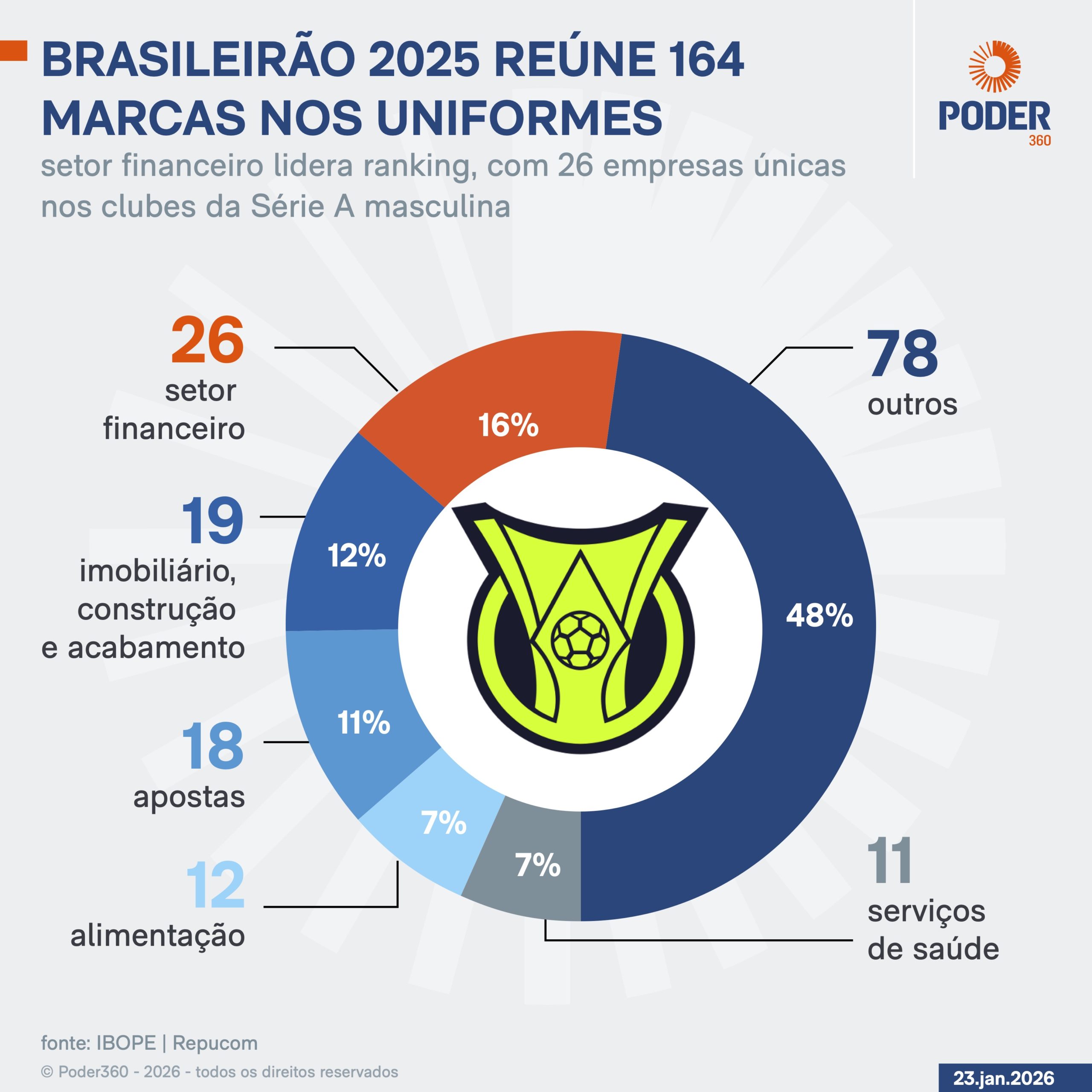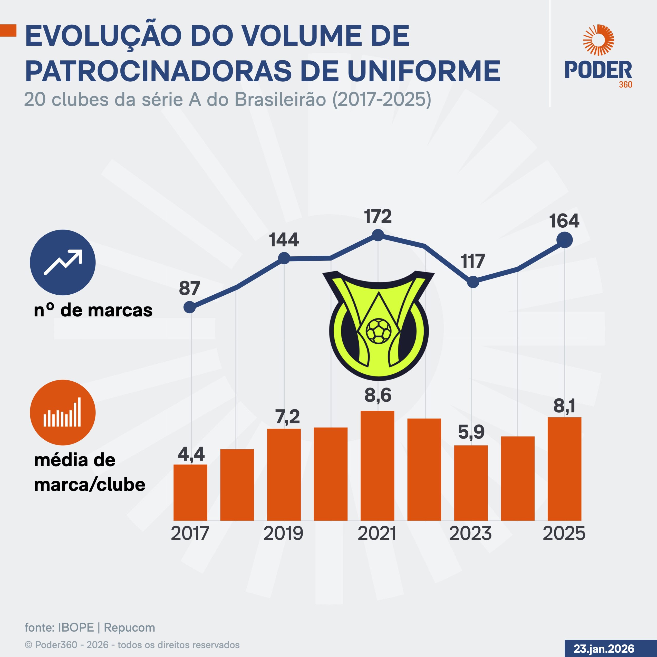 A Série A do Campeonato Brasileiro 2025 registrou o maior número de patrocínios nos uniformes desde 2021, com 164 marcas únicas entre os 20 clubes participantes. Em 2021, o campeonato havia alcançado 172 marcas. Os dados são do estudo Mapa do Patrocínio de Uniformes de Futebol no Brasil 2025, divulgado pelo Ibope Repucom na 5ª feira (22.jan.2026).