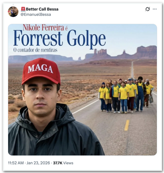 Na 6ª feira (24.jan.2026), expressões como “Forrest Golpe” circularam no X (ex-Twitter). Usuários também recorreram a variações do nome do personagem interpretado por Tom Hanks, em postagens críticas.