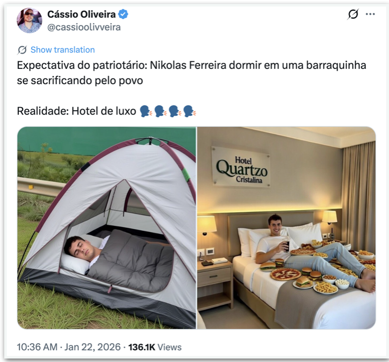A caminhada de 240 km do deputado federal Nikolas Ferreira (PL-MG) até Brasília passou a ser alvo de memes nas redes sociais, com trocadilhos que a comparam ao filme “Forrest Gump”. A mobilização, iniciada em 19 de janeiro, em Paracatu (MG), deve terminar no domingo (25.jan.2026).