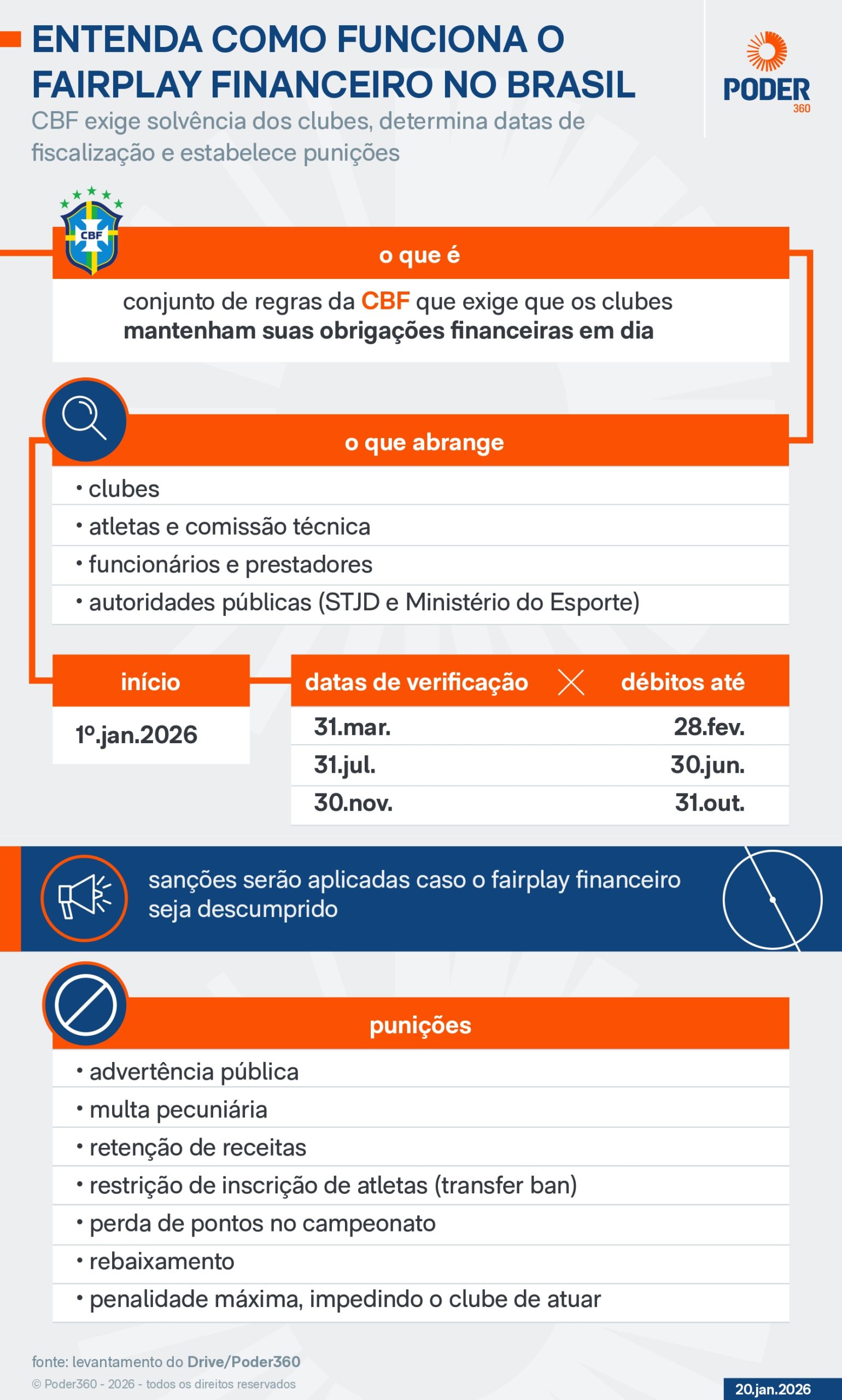 As demonstrações financeiras dos clubes devem ser entregues até 30 de abril do ano seguinte, acompanhadas de relatório de auditor independente registrado na CVM (Comissão de Valores Mobiliários). O orçamento anual precisa ser apresentado até 15 de dezembro do ano anterior, devidamente aprovado pela administração do clube. Esta última regra tem caráter educativo, sem intervenções da agência ou punições, mas há expectativa de que, no futuro, o sistema aponte possíveis violações ao regulamento com base nas projeções.