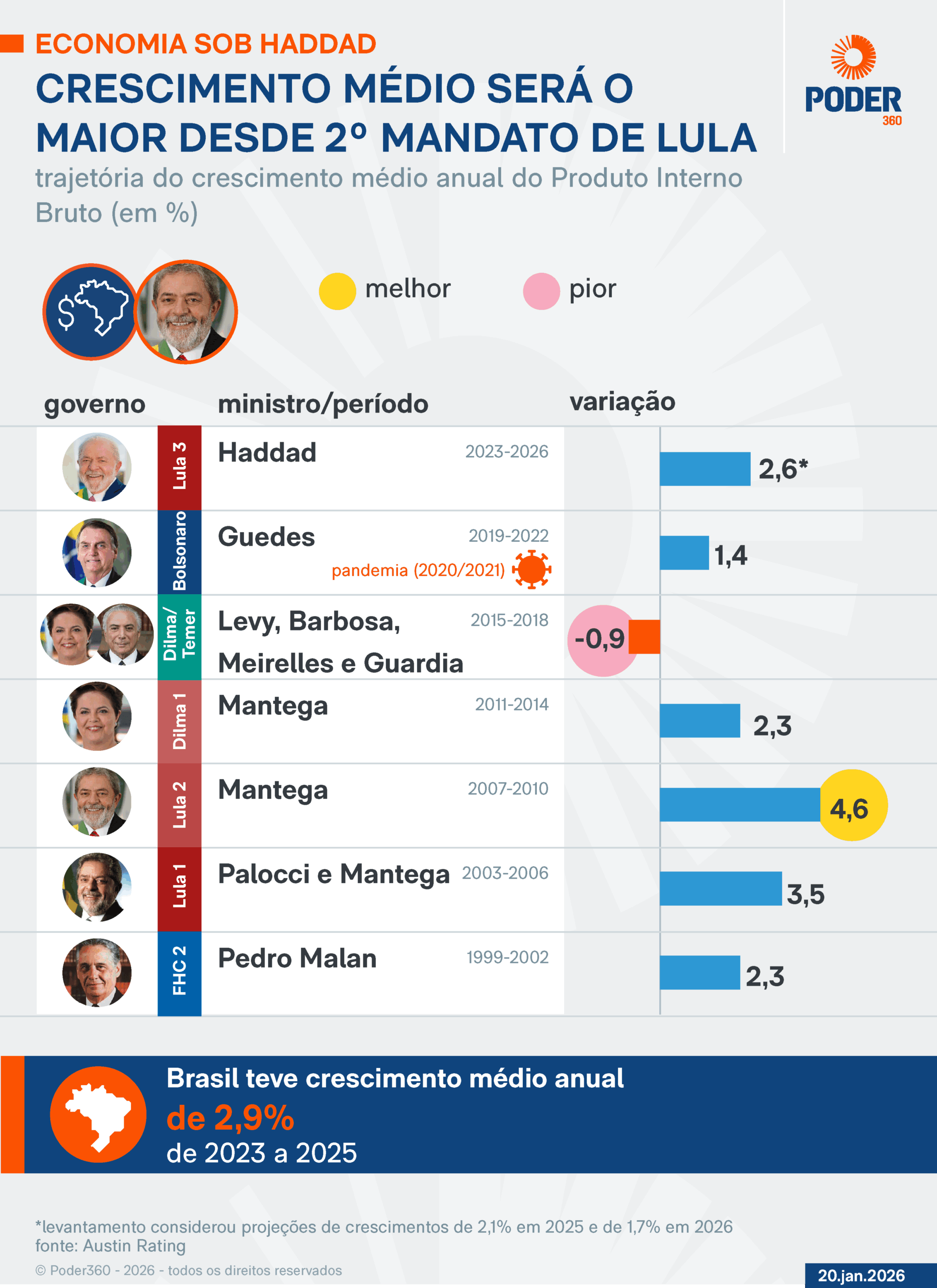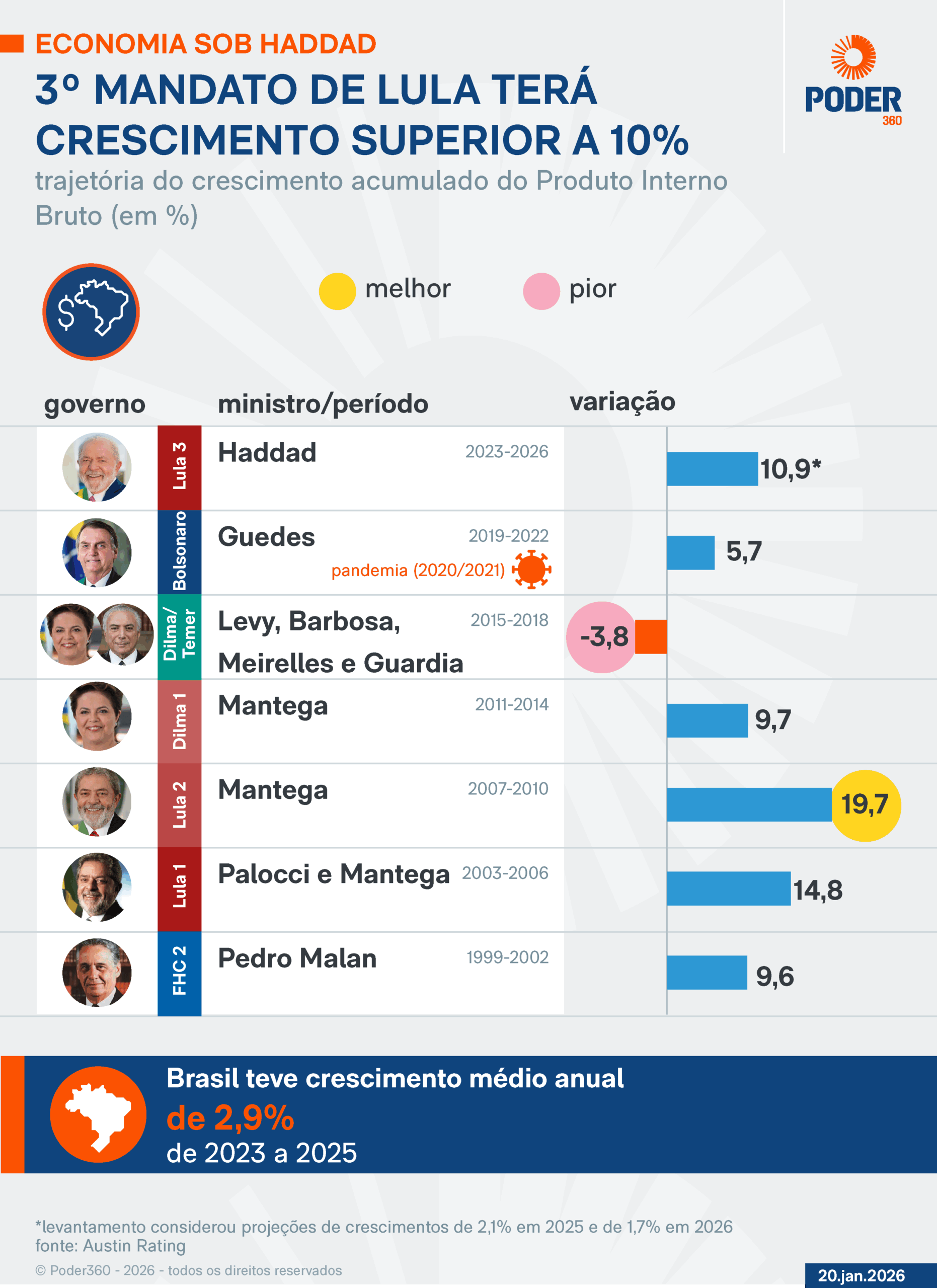 O IBGE (Instituto Brasileiro de Geografia e Estatística) já publicou que o Brasil cresceu 3,2% em 2023 e 3,4% em 2024. O economista-chefe da Austin Rating, Alex Agostini, calculou o crescimento acumulado do quadriênio considerando esses resultados e as projeções de alta de 2,1% em 2025 e de 1,7% em 2026 do PIB (Produto Interno Bruto).