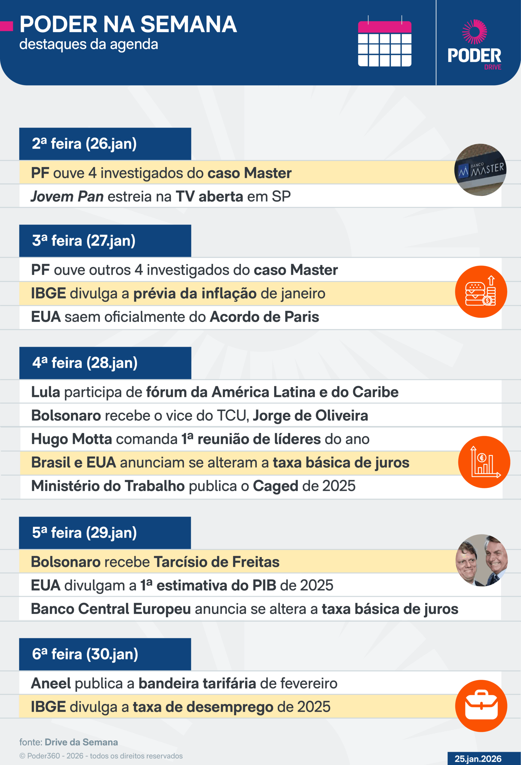 O jornal digital Poder360 traz nesta 2ª feira (26.jan.2026) uma seleção dos assuntos que devem ser destaques na agenda do poder e da política nesta semana.