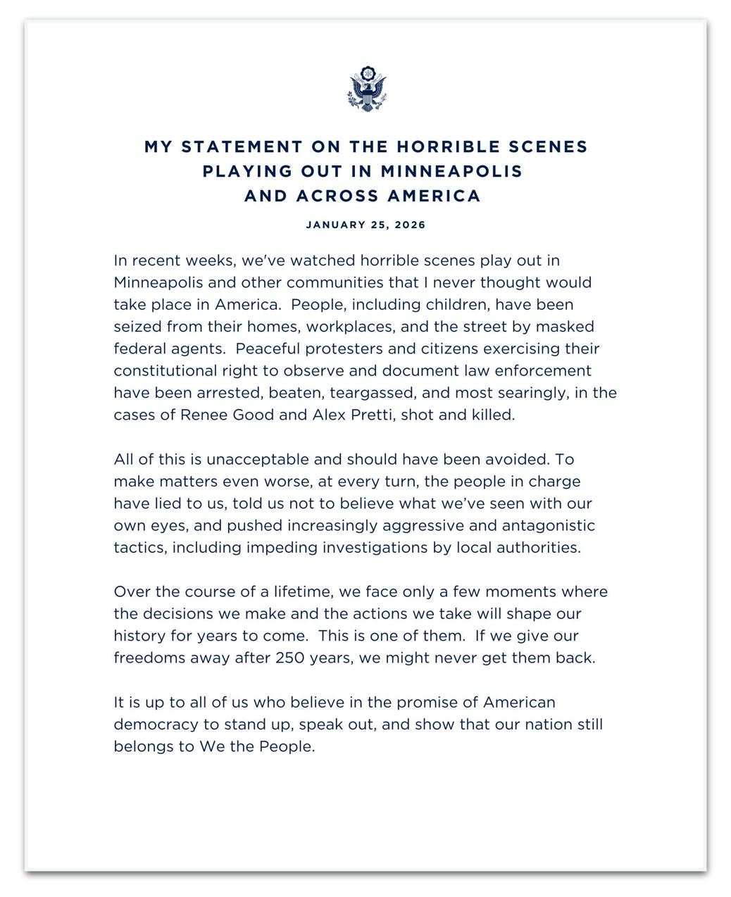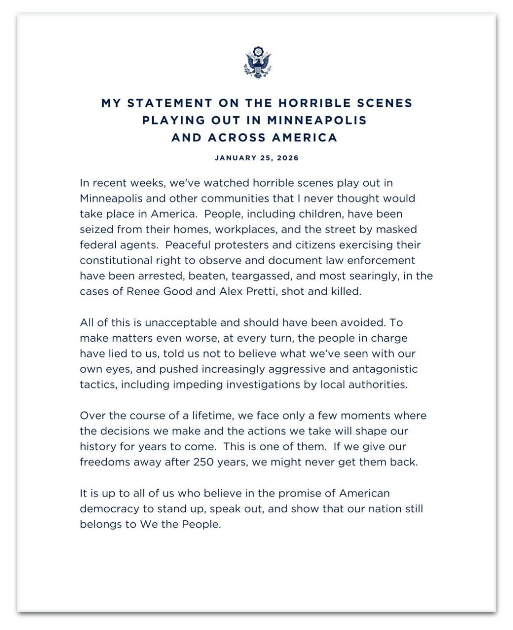 Segundo Clinton, pessoas, “inclusive crianças”, foram retiradas de suas casas, locais de trabalho e das ruas por agentes federais mascarados. Ele escreveu que cidadãos e manifestantes pacíficos, que exerciam o direito constitucional de observar e registrar ações da polícia, foram presos, agredidos e atingidos por gás lacrimogêneo. “E, de forma ainda mais alarmante, nos casos de Renee Good e Alex Pretti, foram baleados e mortos”, declarou.