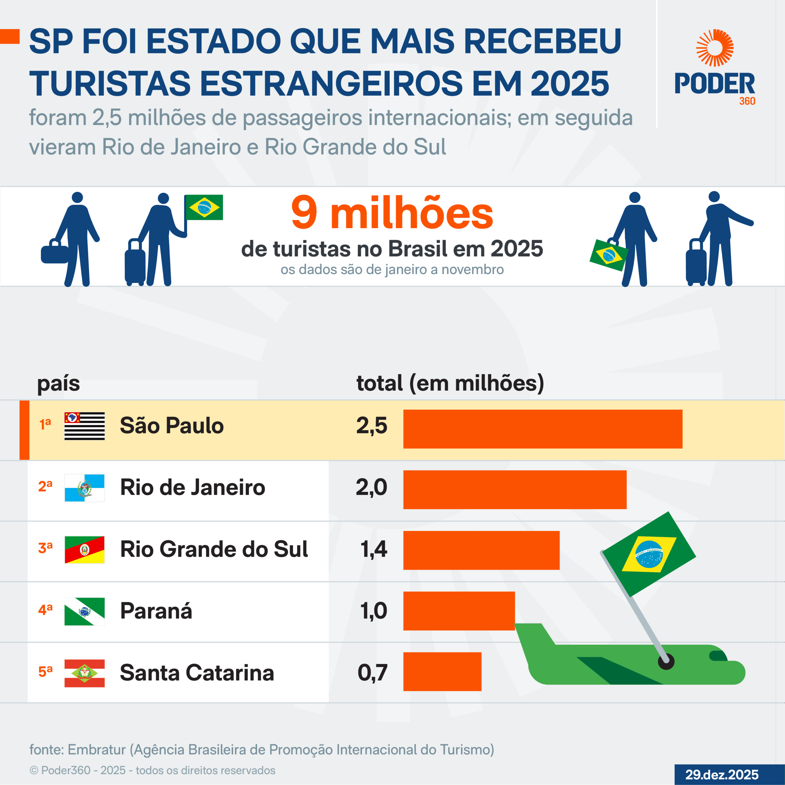 O Estado de São Paulo foi o principal destino de estrangeiros em 2025, com 2,5 milhões de chegadas de janeiro a novembro. Em seguida vieram Rio de Janeiro (2,0 milhões), Rio Grande do Sul (1,4 milhão), Paraná (958 mil) e Santa Catarina (651 mil).