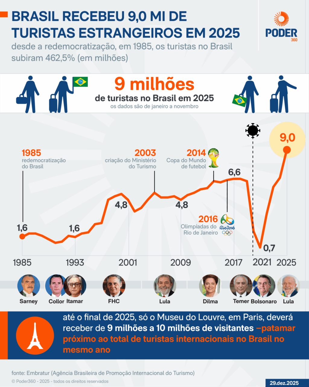 O volume de turistas estrangeiros no Brasil ainda é comparável ou inferior ao número de visitantes registrados por grandes atrações internacionais. O Museu do Louvre, em Paris (França), por exemplo, recebeu de 9 milhões a 10 milhões de visitantes em 2025, segundo dados divulgados pela própria instituição.