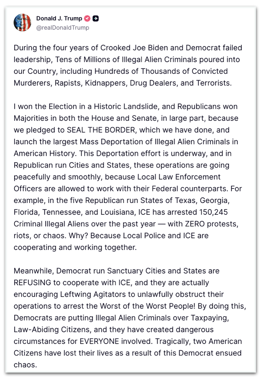 “Eu venci a eleição em uma vitória histórica por goleada e os republicanos conquistaram maiorias tanto na Câmara quanto no Senado, em grande parte porque prometemos selar a fronteira, o que fizemos, e lançar a maior deportação em massa de criminosos estrangeiros ilegais da história norte-americana. Esse esforço de deportação está em andamento e, em cidades e Estados governados por republicanos, essas operações estão se dando de forma pacífica e tranquila, porque os oficiais de aplicação da lei locais têm permissão para trabalhar com seus homólogos federais. Por exemplo, nos 5 Estados governados por republicanos do Texas, Geórgia, Flórida, Tennessee e Louisiana, o ICE prendeu 150.245 criminosos estrangeiros ilegais ao longo do último ano –com zero protestos, tumultos ou caos. Por quê? Porque a polícia local e o ICE estão cooperando e trabalhando juntos.