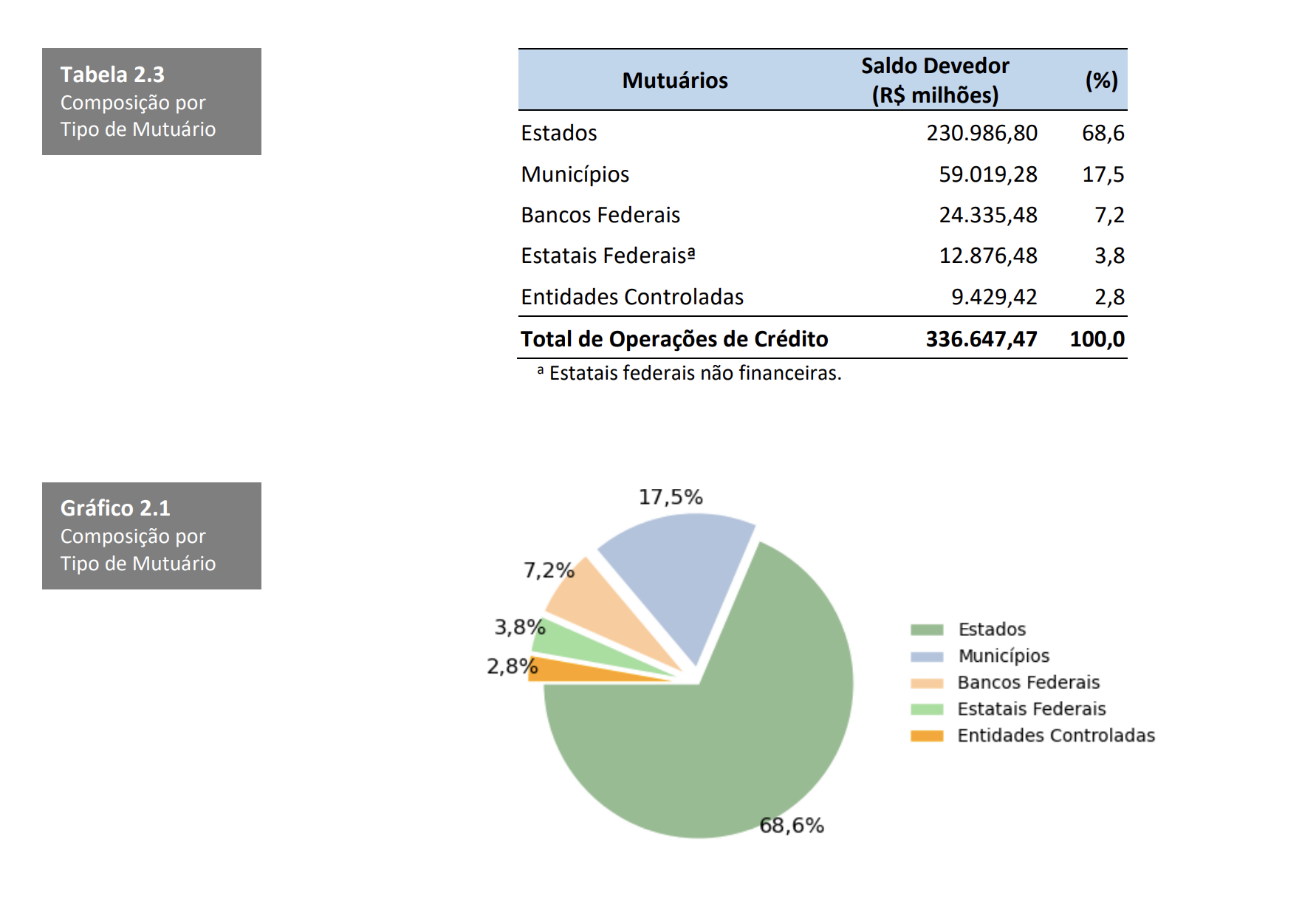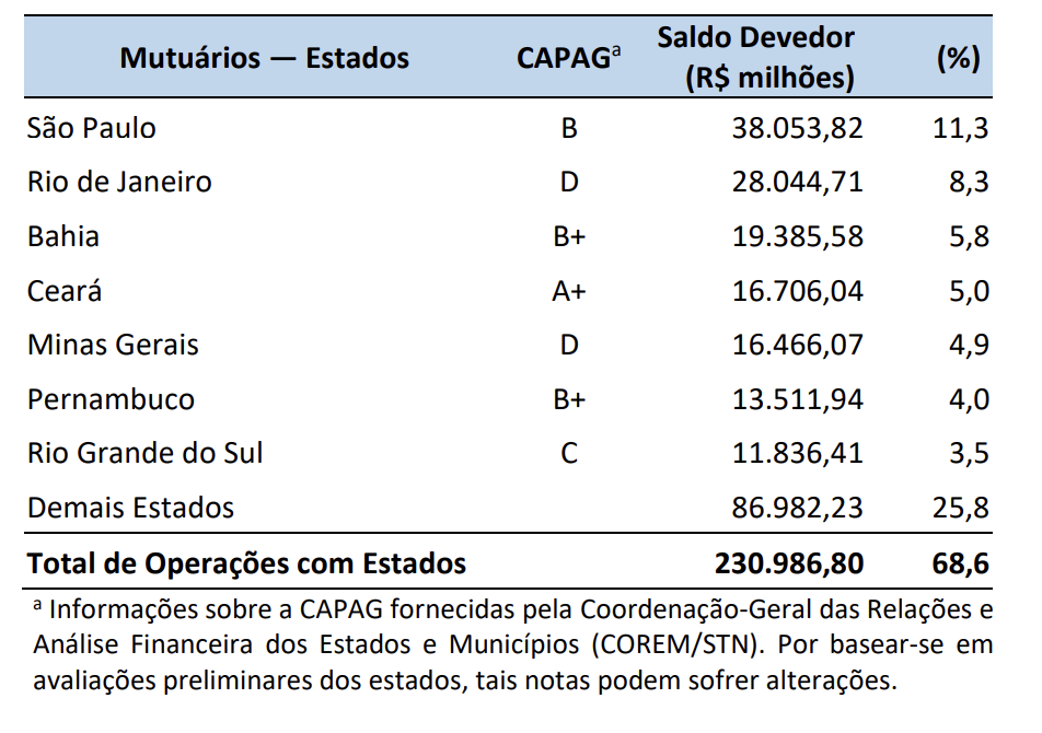 Os Estados concentram a maior fatia das garantias concedidas pela União, respondendo por 68,6% do saldo devedor total, o equivalente a R$ 230,99 bilhões.