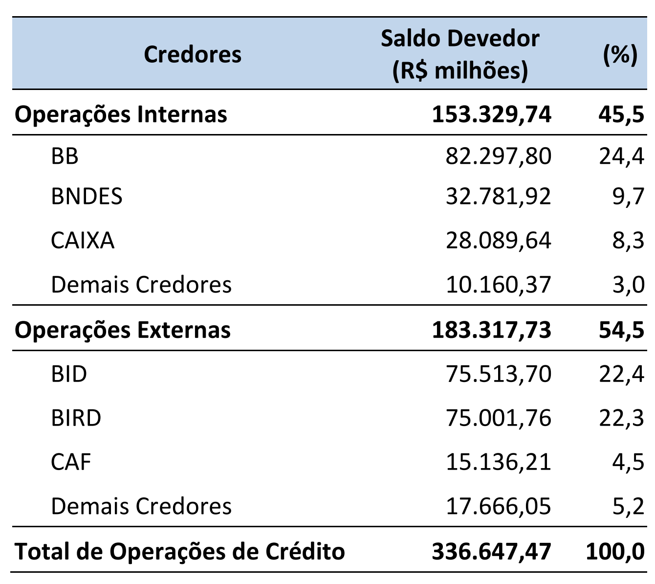 Os bancos federais são responsáveis por 93,5%, ou R$ 143,33 bilhões, das operações de crédito interna. O Banco do Brasil detém 24,4% do total. O top 3 é formado por BNDES (9,7%) e Caixa Econômica Federal (8,3%).
