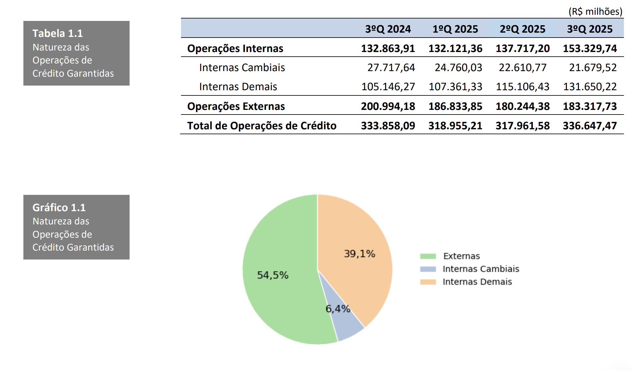O saldo devedor das garantias concedidas pelo Tesouro Nacional nas operações de crédito totalizou R$ 336,65 bilhões em 2025.