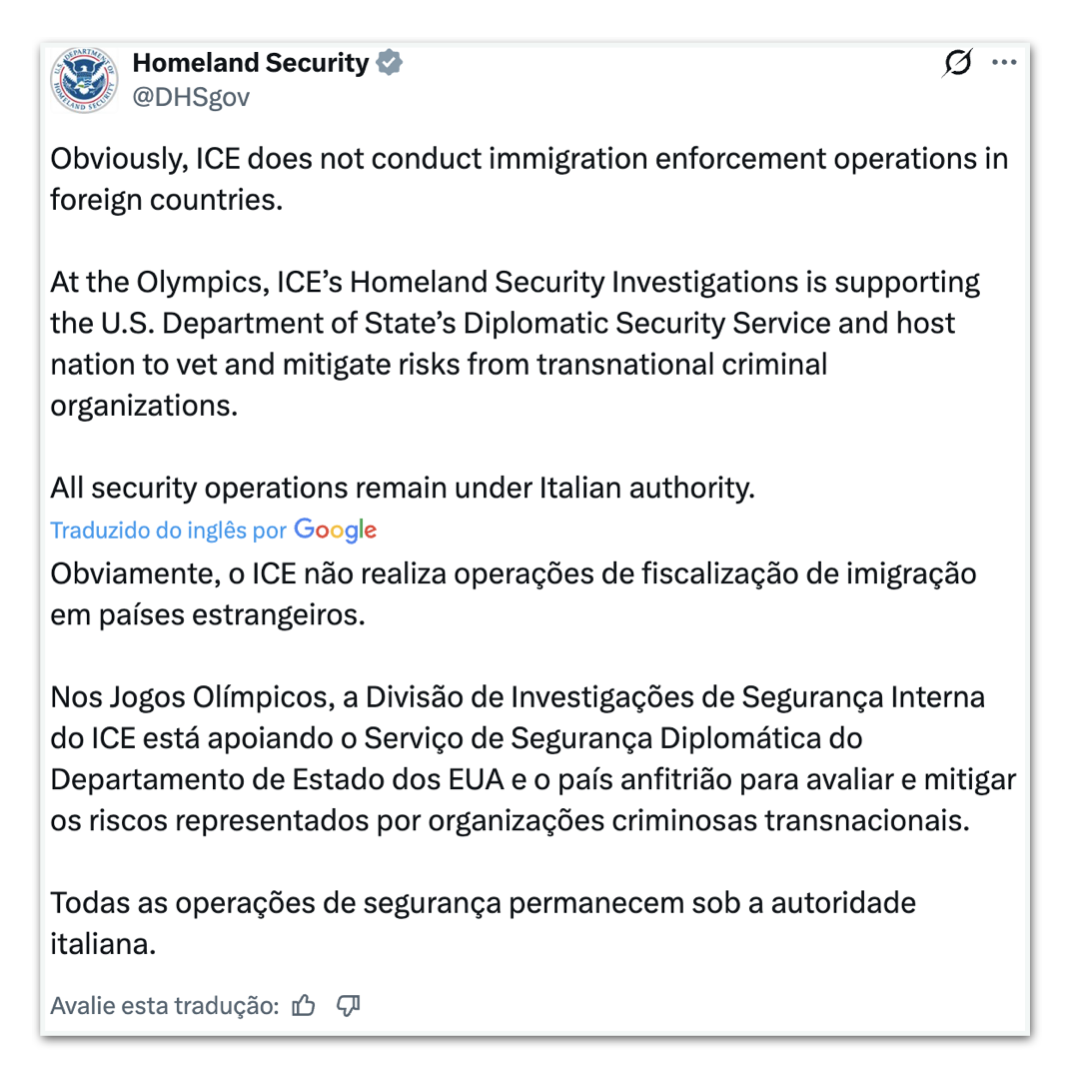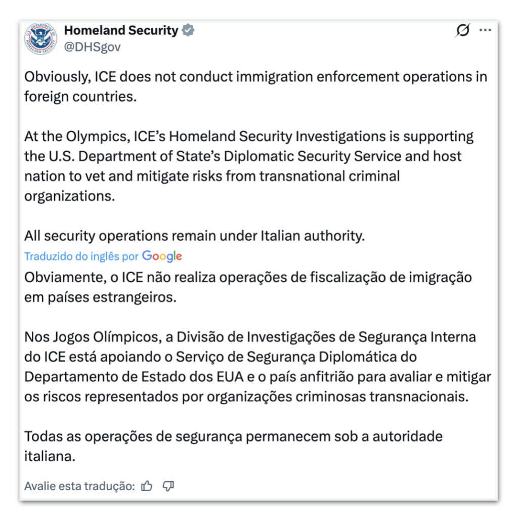 A Divisão de Investigações de Segurança Interna do ICE dará apoio ao Serviço de Segurança Diplomática do Departamento de Estado dos EUA durante os Jogos de Milão-Cortina, marcados para 6 a 22 de fevereiro, informou o DHS (Departamento de Segurança Interna dos EUA).