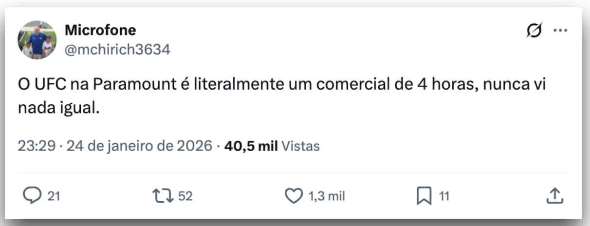 Disputado no sábado (24.jan.2026), o UFC 324 marcou a estreia da parceria entre a organização e a Paramount na temporada 2026. De acordo com a empresa, a transmissão atingiu mais lares do que qualquer outro evento ao vivo do UFC nos últimos 10 anos.