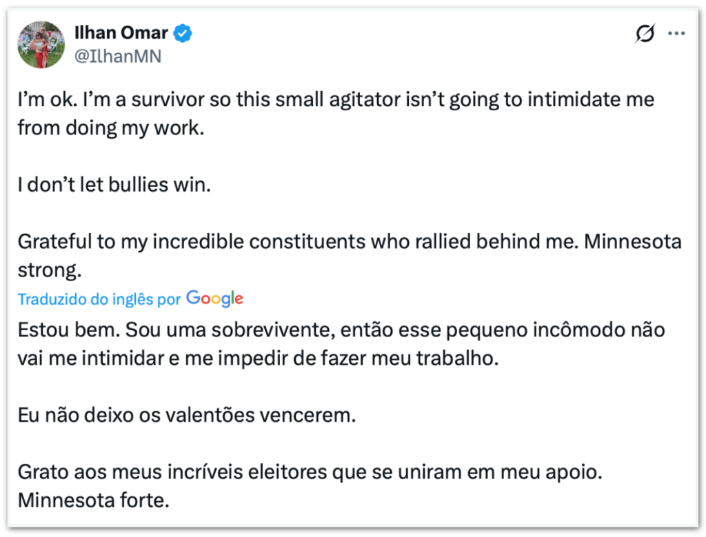 Em publicação nas redes sociais, a deputada disse que não se deixaria intimidar. “Estou bem. Sou uma sobrevivente, então esse pequeno agitador não vai me intimidar nem me afastar do meu trabalho. Eu não deixo valentões vencerem”, escreveu. Em nota, seu gabinete informou que a polícia de Minneapolis agiu rapidamente e que Omar seguiu com a reunião “porque não deixa valentões vencerem”.