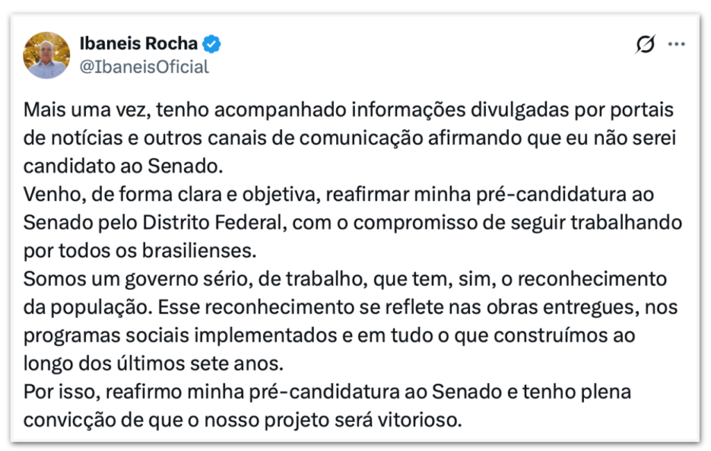 “Venho, de forma clara e objetiva, reafirmar minha pré-candidatura ao Senado pelo Distrito Federal, com o compromisso de seguir trabalhando por todos os brasilienses”, afirmou em uma publicação no X. Segundo Ibaneis, o governo local tem reconhecimento da população, refletido em obras entregues e programas sociais implementados ao longo dos últimos 7 anos. “Tenho plena convicção de que o nosso projeto será vitorioso”, disse.