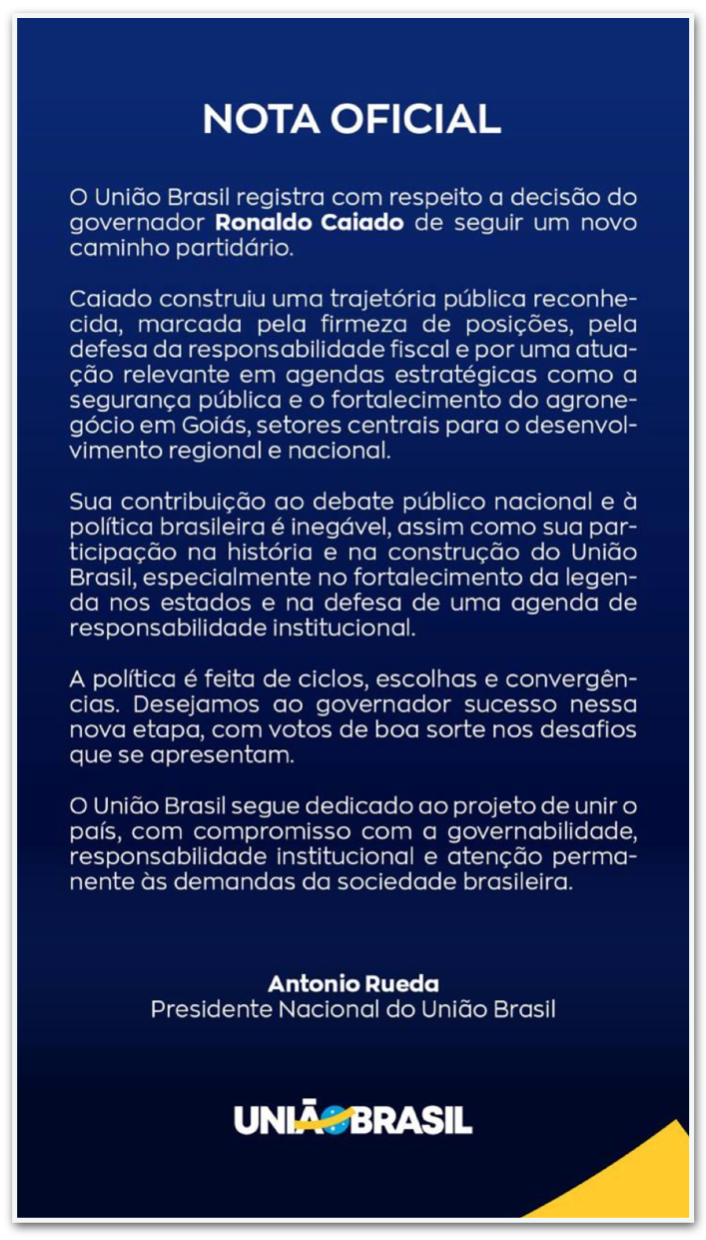 O presidente nacional do União Brasil, Antônio Rueda, divulgou na 3ª feira (27.jan.2026) uma nota oficial sobre a saída de Ronaldo Caiado do partido. No texto, ele afirma que a legenda “registra com respeito” a decisão do governador de Goiás de “seguir um novo caminho partidário”.