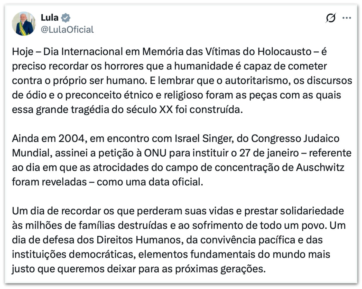 Lula mencionou que, em 2004, assinou a petição à ONU (Organização das Nações Unidas) para instituir o 27 de janeiro como uma data oficial.