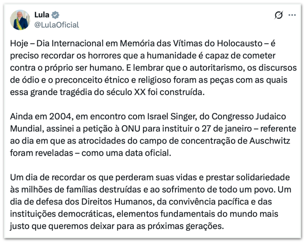 O presidente Luiz Inácio Lula da Silva (PT) divulgou uma nota em memória das vítimas do Holocausto na 3ª feira (27.jan.2026), para lembrar os 81 anos do dia em que tropas soviéticas libertaram os presos de Auschwitz, o maior campo de concentração construído pelos nazistas. Disse que “é preciso recordar os horrores que a humanidade é capaz de cometer contra o próprio ser humano”.