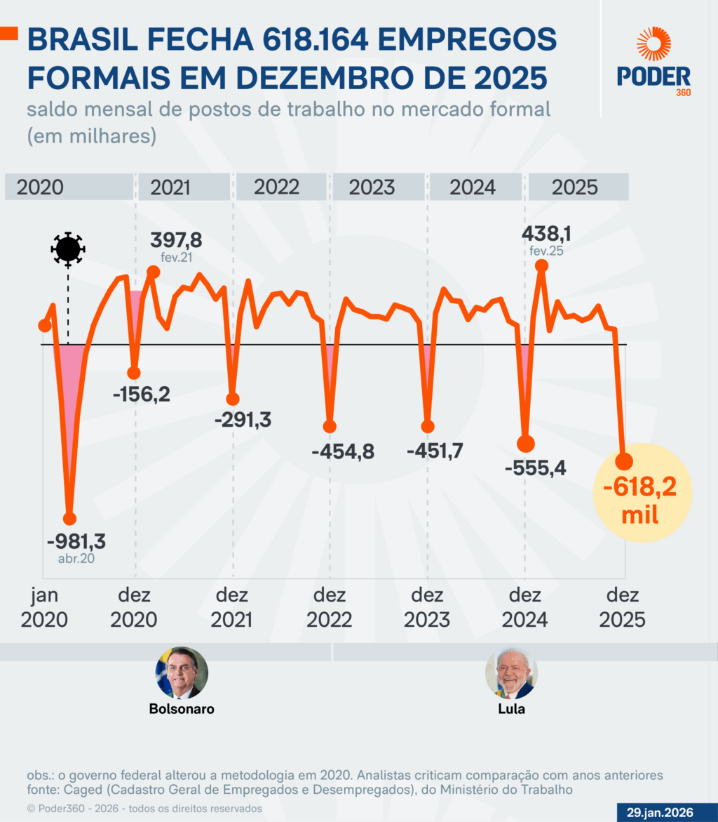 O MTE (Ministério do Trabalho e Emprego) divulgou nesta 5ª feira (29.jan.2026) dados do Caged (Cadastro Geral de Empregados e Desempregados). Leia a íntegra (PDF – 1 MB) da apresentação.