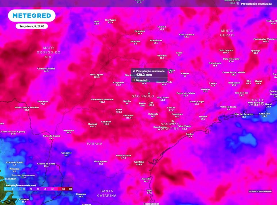 Boa parte do território paulista terá acumulados de chuva acima dos 100 mm até a noite (21h) de terça-feira (3), e chegando em torno dos 120 mm em localidades da região central e das regiões de Presidente Prudente, Araçatuba e Registro, como por exemplo: