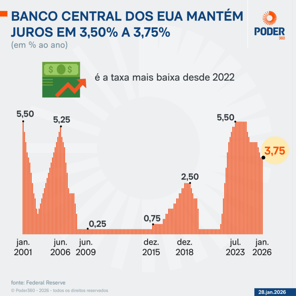 A declaração de Trump se deu 1 dia depois da reunião do Fomc (Comitê Federal de Mercado Aberto) do Fed. Na 4ª feira (28.jan.2026), o órgão decidiu pela manutenção da taxa de juros no intervalo entre 3,50% e 3,75%. O republicano reprovou a medida.
