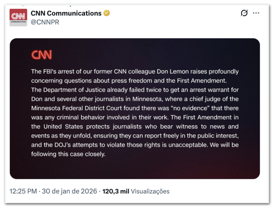 A CNN classificou as ações do Departamento de Justiça como “inaceitáveis” e afirmou que tentativas de violar os direitos garantidos pela Constituição representam uma ameaça direta ao trabalho jornalístico. A empresa disse ainda que o episódio afeta não apenas Don Lemon, mas outros profissionais de mídia que atuavam na cobertura dos eventos em Minnesota.
