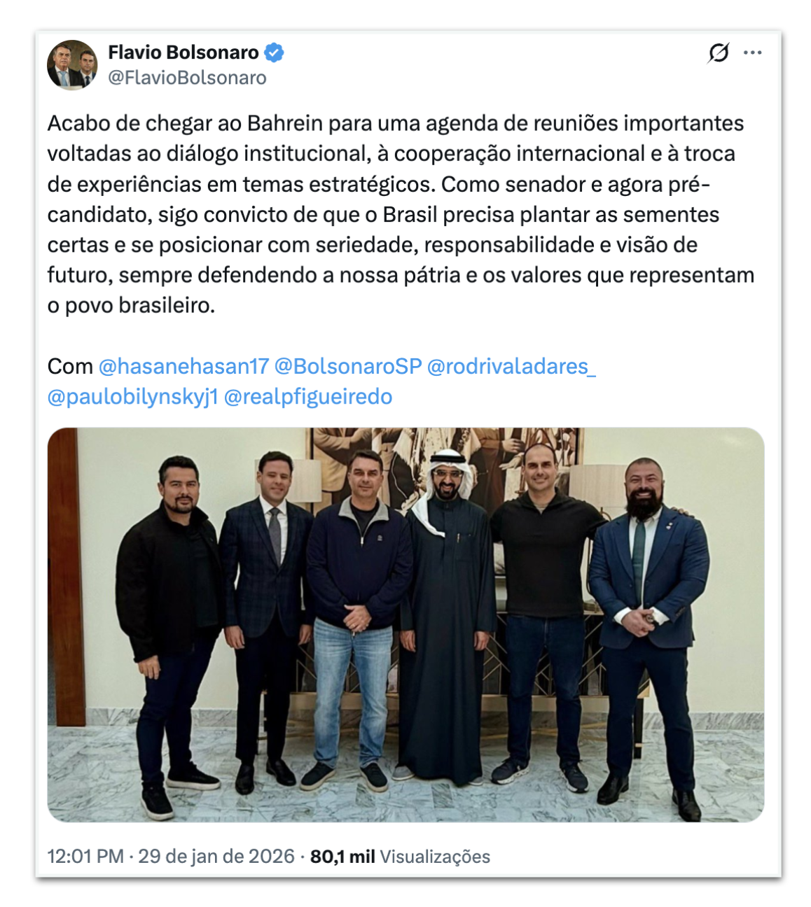 A delegação desembarcou em um aeroporto exclusivo da família real. Também viajaram os deputados federais Paulo Bilynskyj (PL-SP) e Rodrigo Valadares (União Brasil-SE), além do blogueiro Paulo Figueiredo, procurado pela Justiça brasileira. Em seu perfil no X, Flávio disse estar convicto de que “o Brasil precisa plantar as sementes certas e se posicionar com seriedade, responsabilidade e visão de futuro”, sempre em defesa da pátria e dos valores do povo brasileiro.