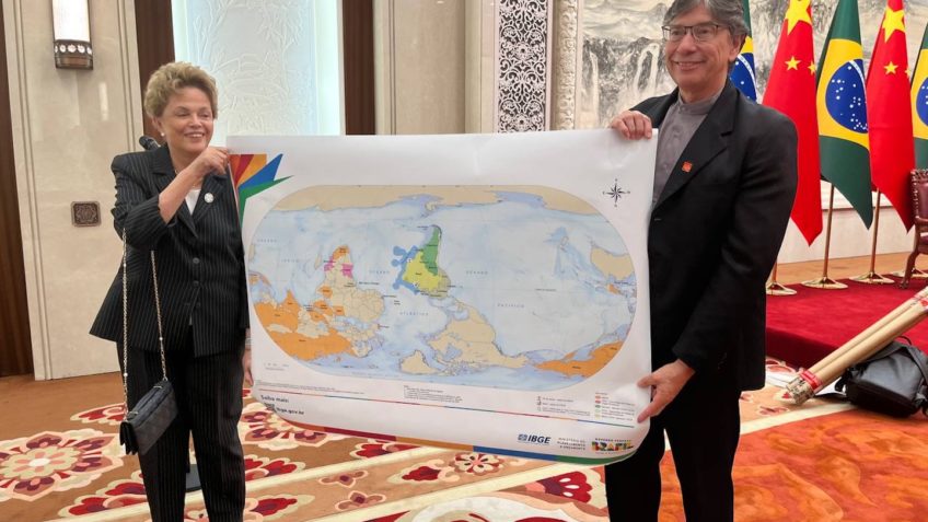 Na imagem, Dilma Rousseff e Marcio Pochmann seguram o mapa-múndi invertido, com Brasil em destaque
