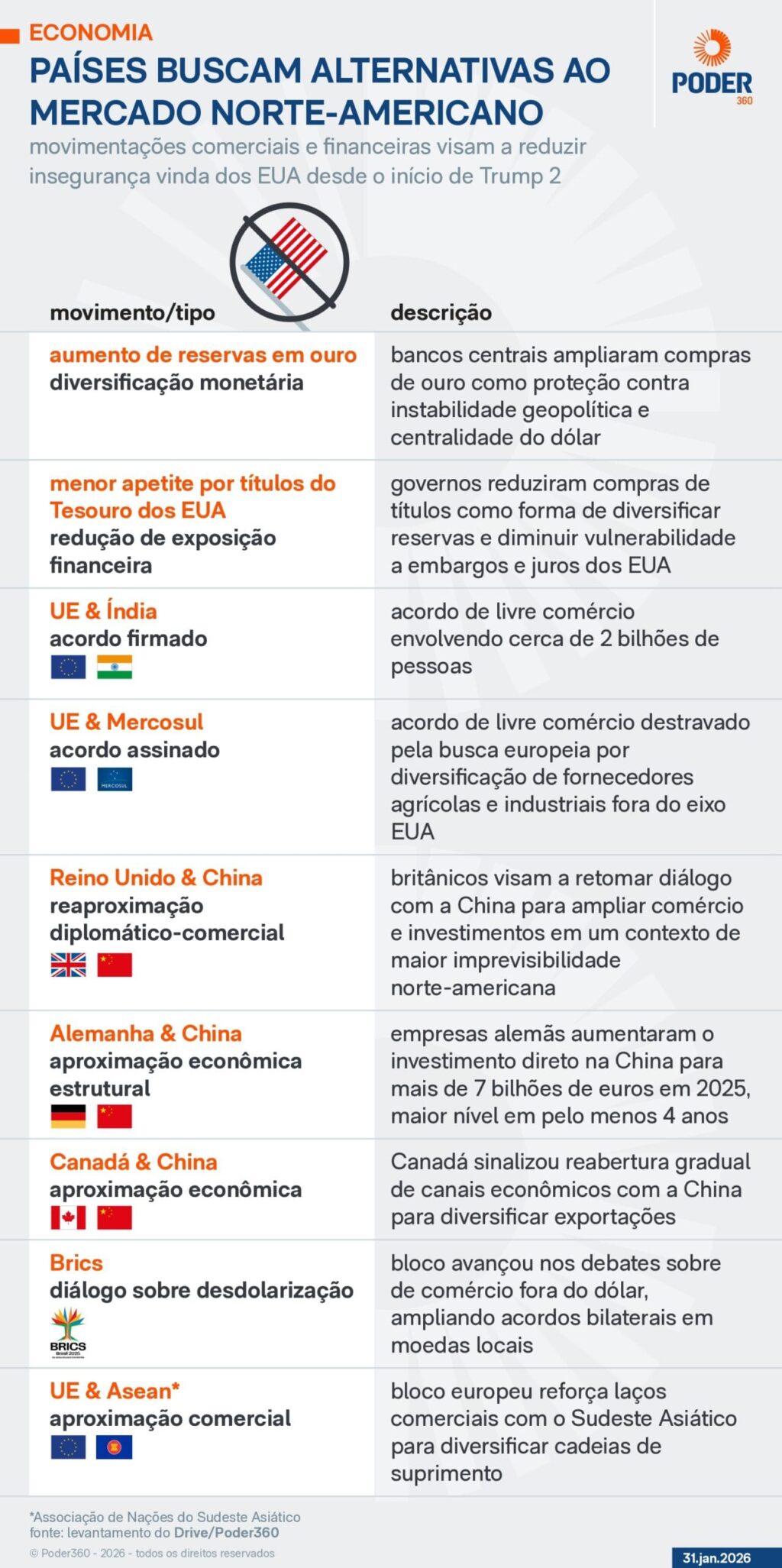 Segundo o mestre em finanças pela Universidade de Sorbonne Hulisses Dias declarou ao Poder360, o que se dá é um movimento pragmático de defesa: “Diversificar risco significa criar rotas alternativas, novos fornecedores, acordos paralelos e redundância em cadeias críticas, assim como reduzir a dependência estrutural. Por outro lado, exigiria trocar o ‘sistema operacional’ da economia global, que ainda funciona majoritariamente sobre infraestrutura americana: dólar, mercado de capitais profundo, padrões tecnológicos, segurança jurídica e liquidez”.