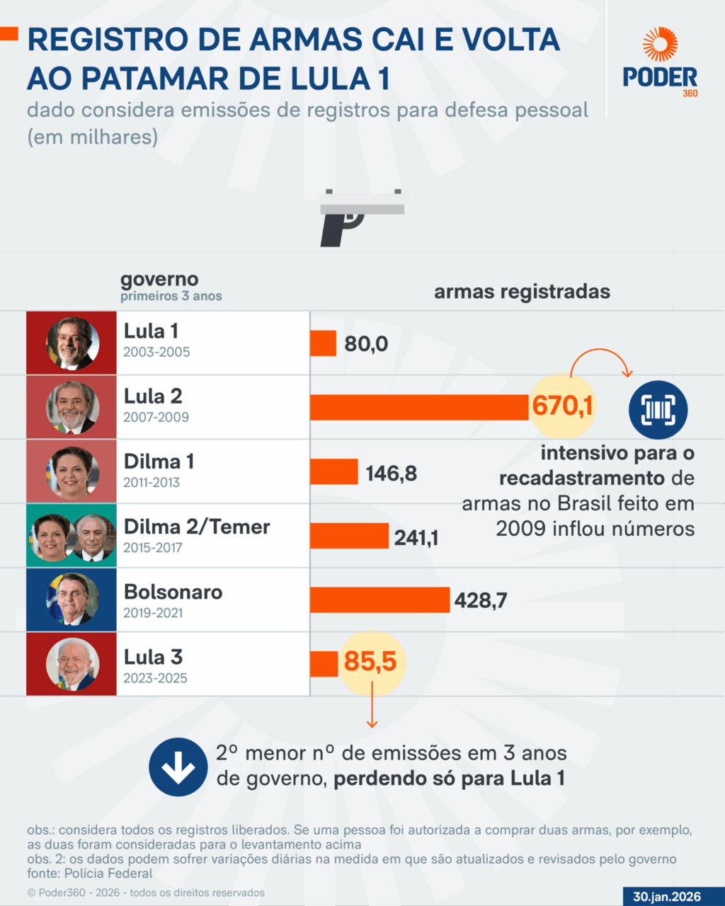 O recorde de registros nos 3 anos iniciais de um governo foi no 2º mandato de Lula, quando foi feito um intensivo para recadastramento das armas que haviam sido registradas até 2003, na publicação do Estatuto do Desarmamento. O prazo foi estendido algumas vezes e muitos cadastros ficaram represados, demorando alguns meses para entrar no sistema.