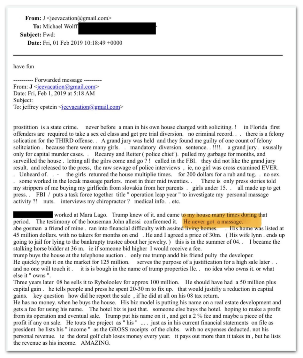 Entre os milhares de documentos do caso Epstein está um e-mail de 1ª de fevereiro de 2019 enviado pelo empresário para Michael Wolff. Na mensagem, que tem sido muito compartilhada por aliados do republicano nas redes sociais, o executivo diz ao escritor que Trump foi “muitas vezes” a sua casa, mas que “nunca ganhou uma massagem” –que pode ser interpretado como algum tipo de atividade sexual.