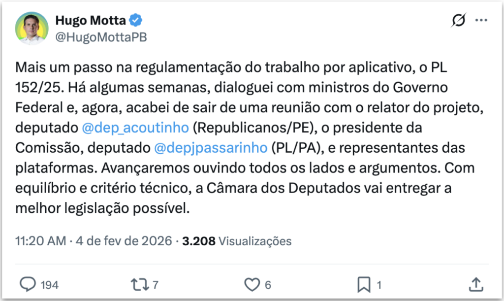 O presidente da Câmara dos Deputados, Hugo Motta (Republicanos), anunciou progressos nas discussões sobre a regulamentação do trabalho por aplicativo. A declaração foi feita nesta 4ª feira (4.fev.2026) em publicação no X, depois de reuniões com ministros, congressistas e representantes do setor para debater o substitutivo ao PLP (Projeto de Lei Complementar) 152/25.