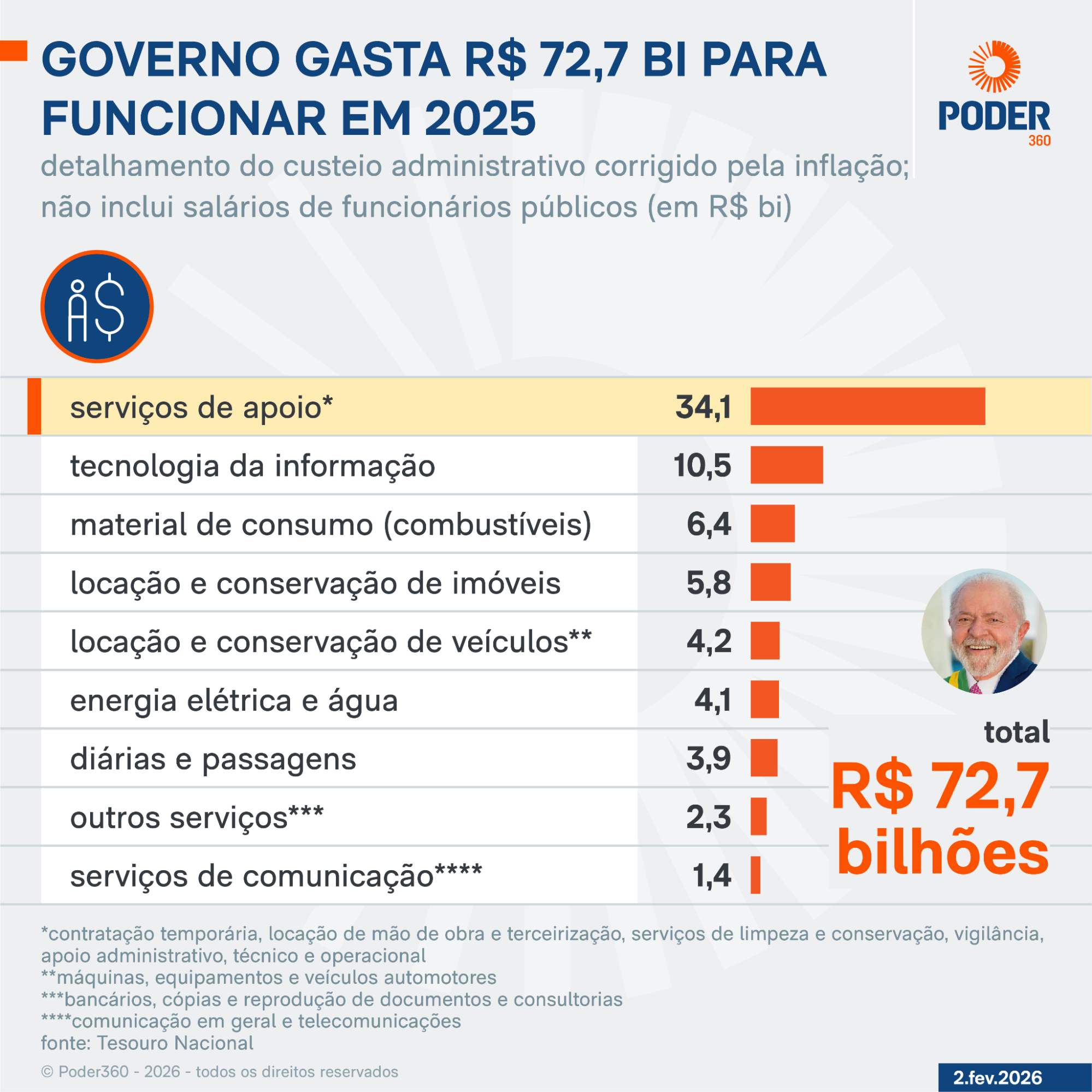 As despesas com serviço de apoio somaram R$ 34,1 bilhões em 2025. São custos com contratação temporária, terceirizados e limpeza.