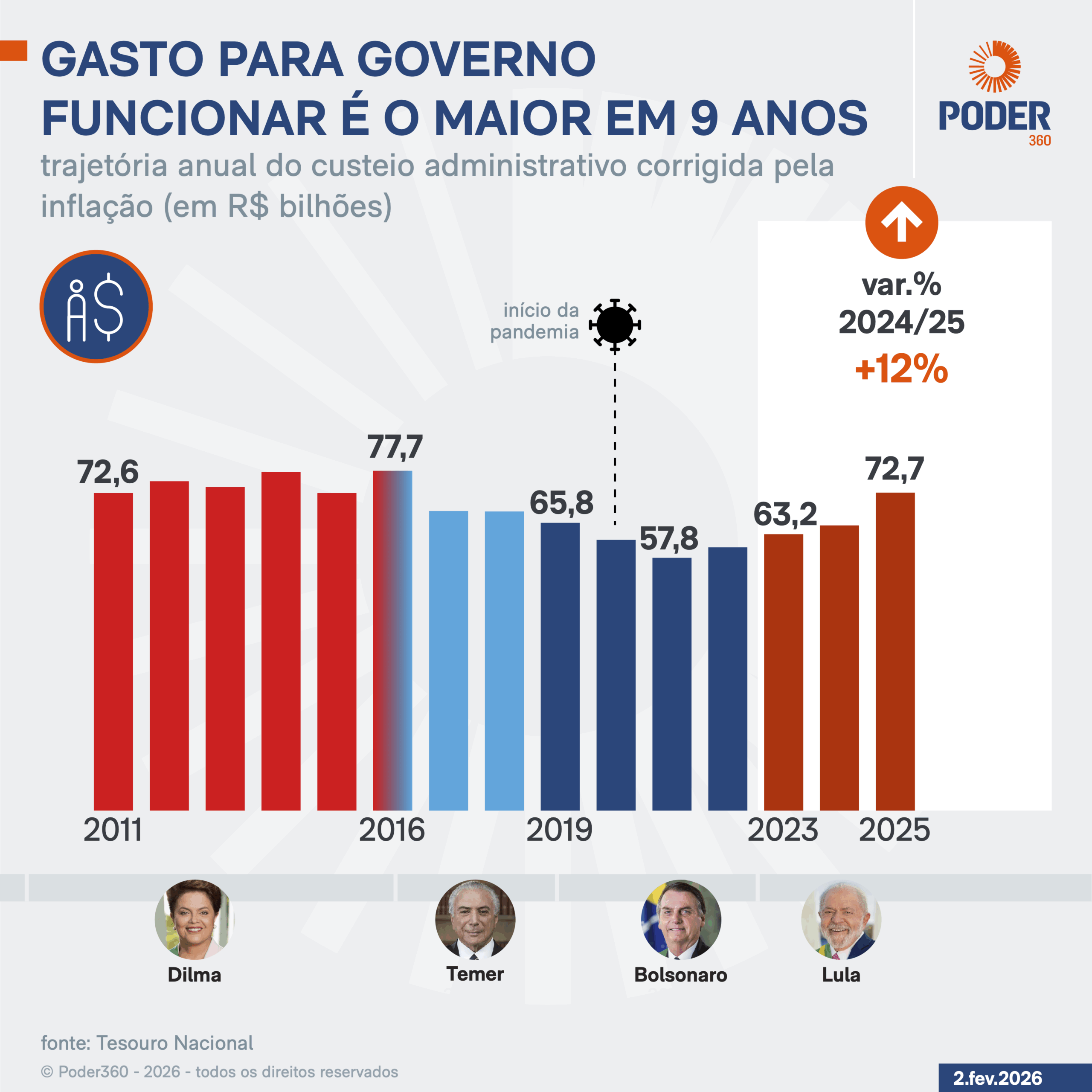 Os gastos com a administração pública federal totalizaram R$ 72,7 bilhões em 2025. A alta real (descontada a inflação) é de 11,6% na comparação com 2024, quando a despesa foi de R$ 65,2 bilhões.