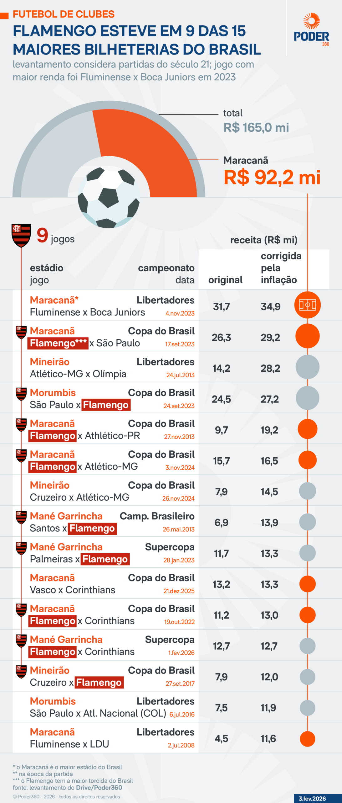 O Flamengo participou de 9 das 15 maiores bilheterias do futebol brasileiro no século 21, segundo levantamento do Poder360 com jogos realizados de 2001 a 2026. A partida com maior arrecadação do período foi a final da Libertadores de 2023 entre Fluminense e Boca Juniors, no Maracanã, que registrou receita original de R$ 31.702.250.