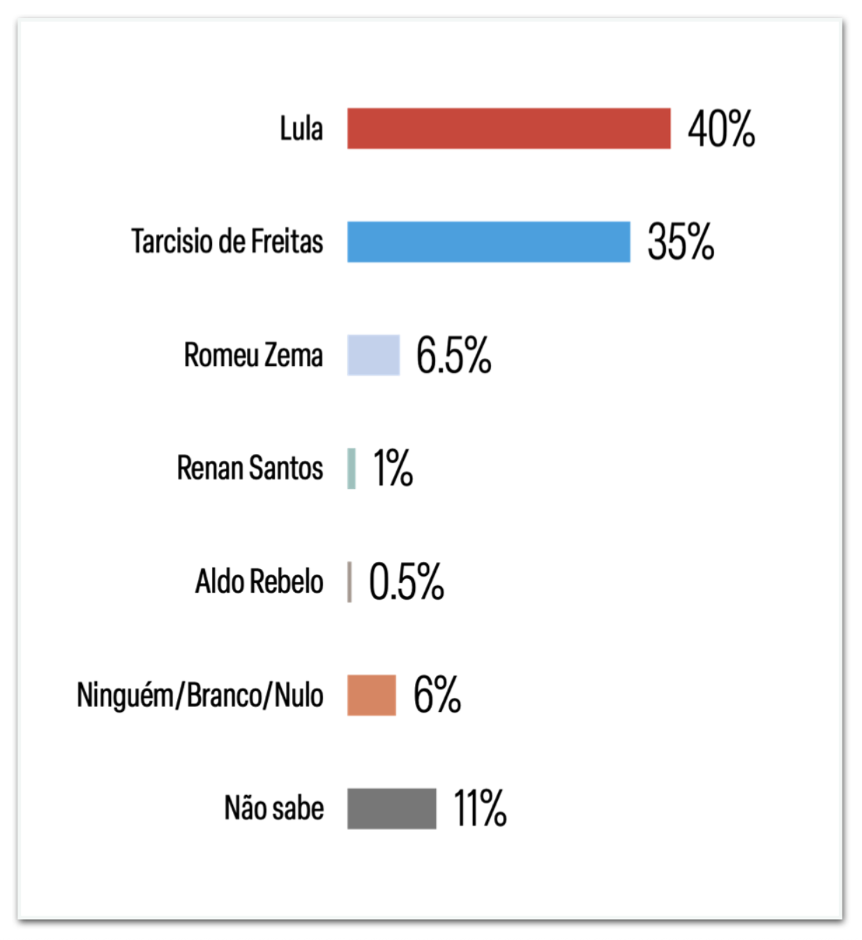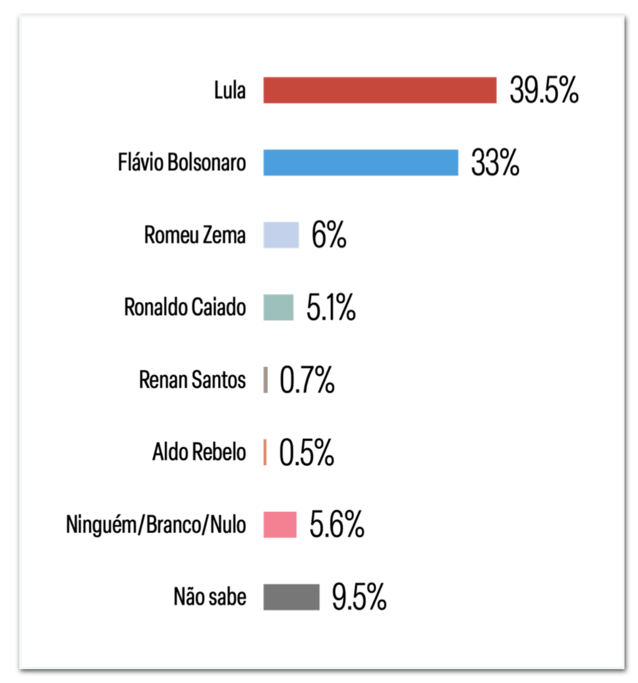 Entre esses 2 cenários, no entanto, Flávio ainda teria melhor desempenho em relação a Lula que Tarcísio, o que aponta para uma consolidação do filho de Jair Bolsonaro (PL) na disputa.