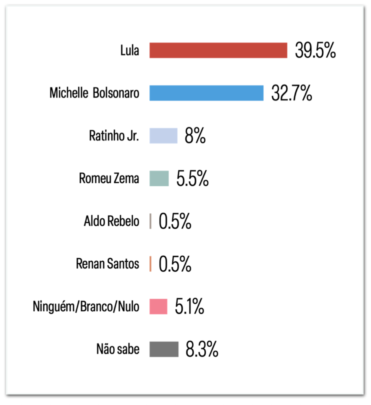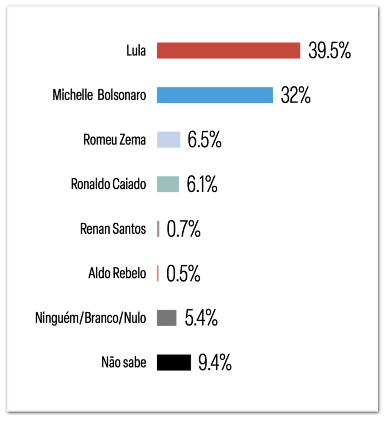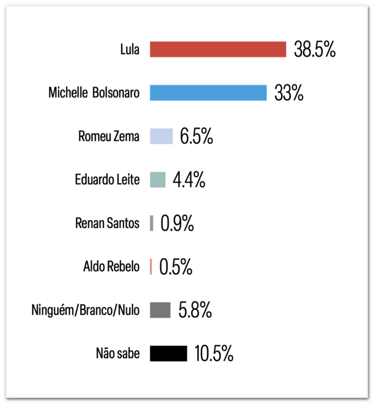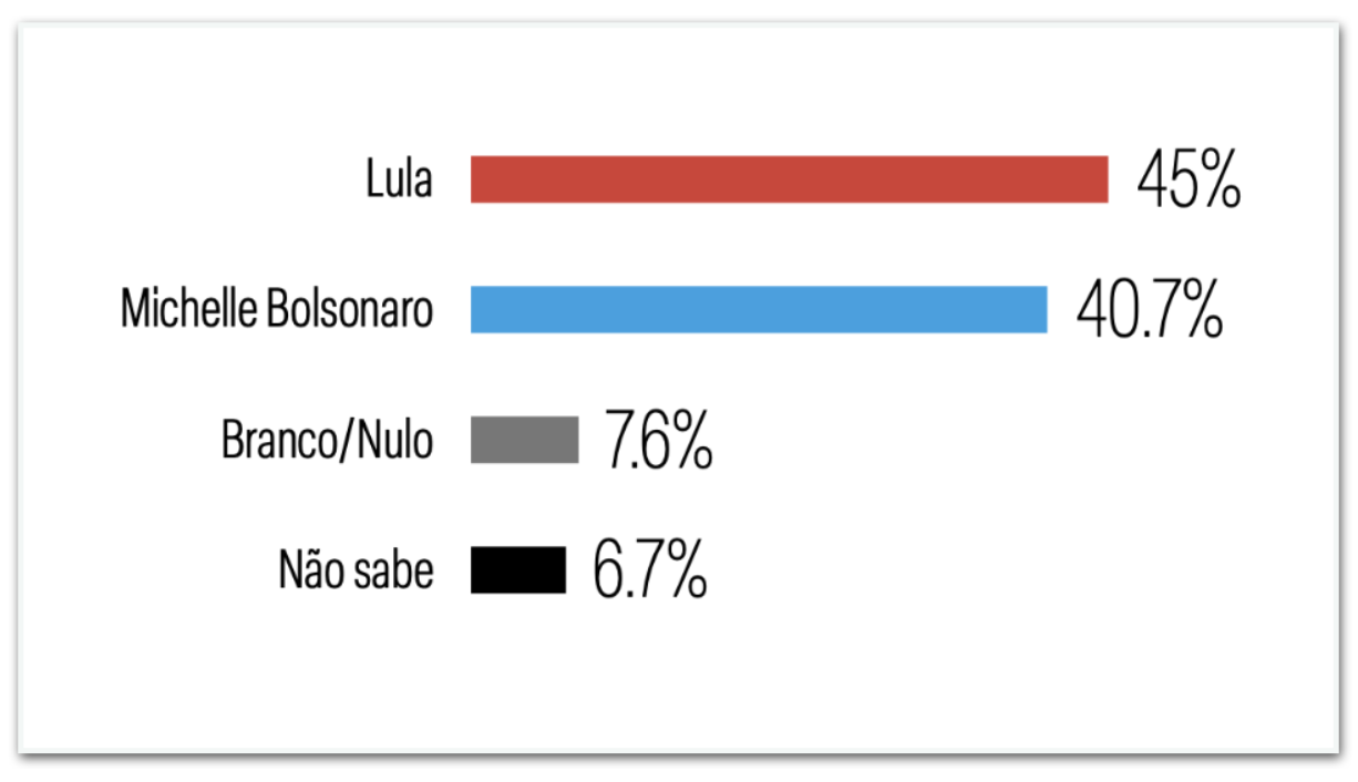 Porém, a pesquisa mostra um empate técnico caso o presidente fosse para o 2º turno com Flávio, Michelle ou Tarcísio.
