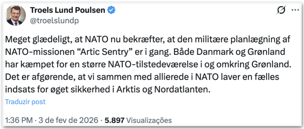 O ministro da Defesa da Dinamarca, Troels Lund Poulsen, chamou de “gratificante” o início do planejamento da missão na região do Ártico. “É crucial que trabalhemos em conjunto com nossos aliados da OTAN para aumentar a segurança no Ártico e no Atlântico Norte”, escreveu em seu perfil no X (ex-Twitter).