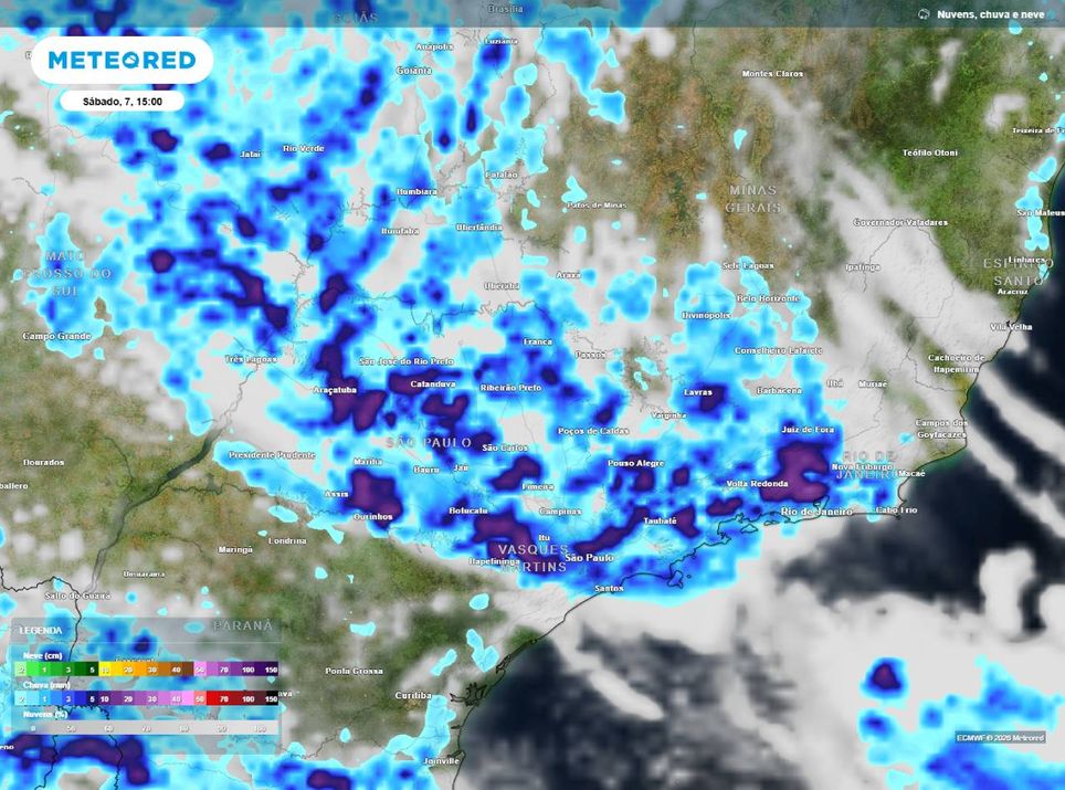 No sábado (7), as instabilidades voltam a ganhar força (mapa acima) e a partir do final da manhã já são esperadas chuvas intensas que podem ocorrer em forma de pancadas e com tempestades em boa parte de São Paulo, incluindo a Região Metropolitana (RMSP), e no Rio de Janeiro. A exceção será o litoral sul paulista.