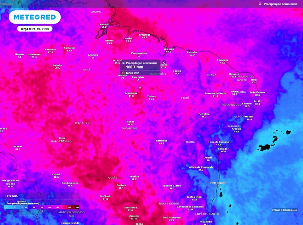 Os acumulados de precipitação (em mm) previstos entre hoje (5) e a terça-feira (10) variam entre 50 mm e 70 mm em grande parte da Região, e podendo pontualmente ficar entre 90 mm e 100 mm em áreas do Ceará e do sul do Maranhão. No extremo sul da Bahia, os volumes ficam abaixo dos 20 mm.
