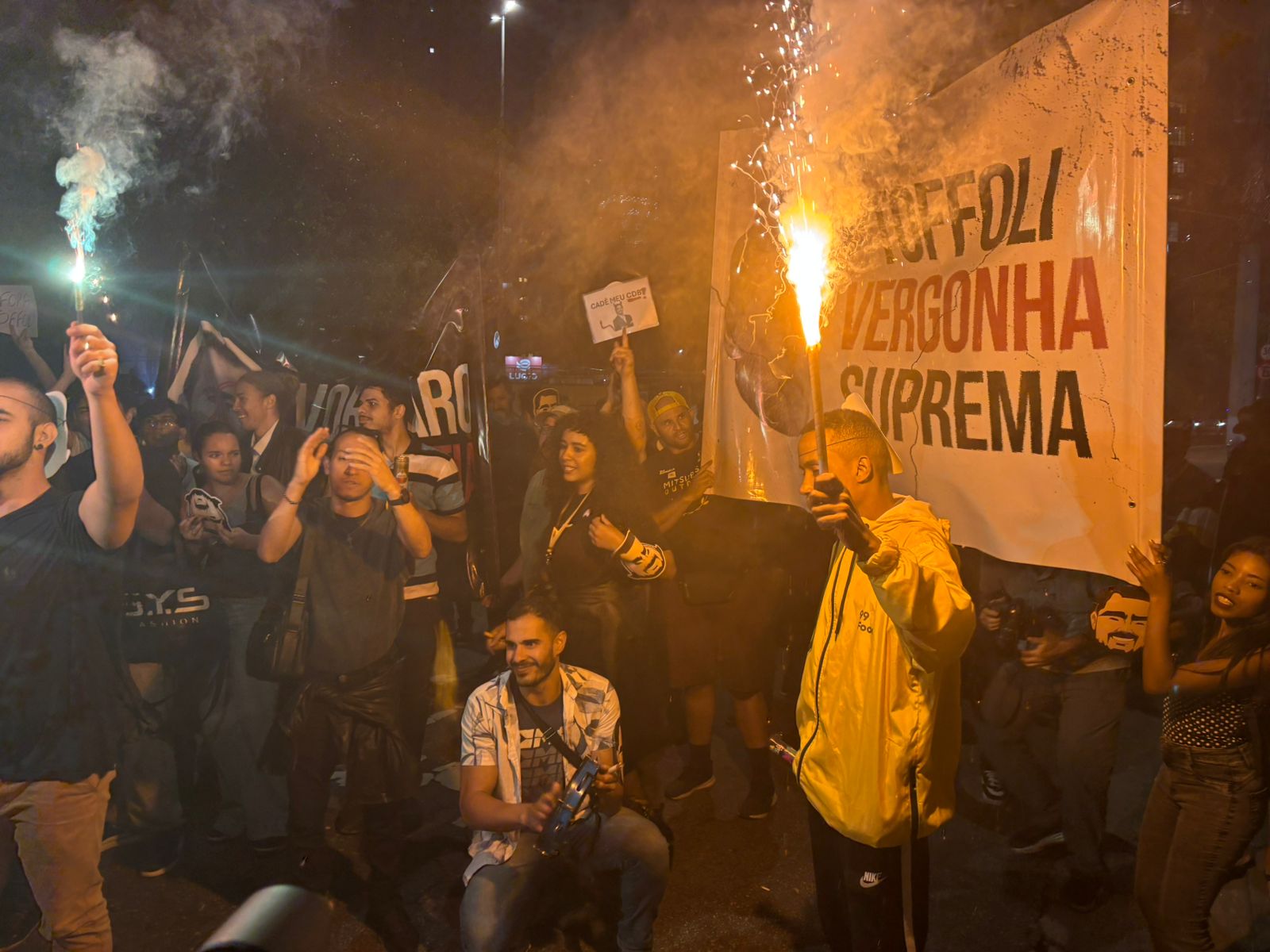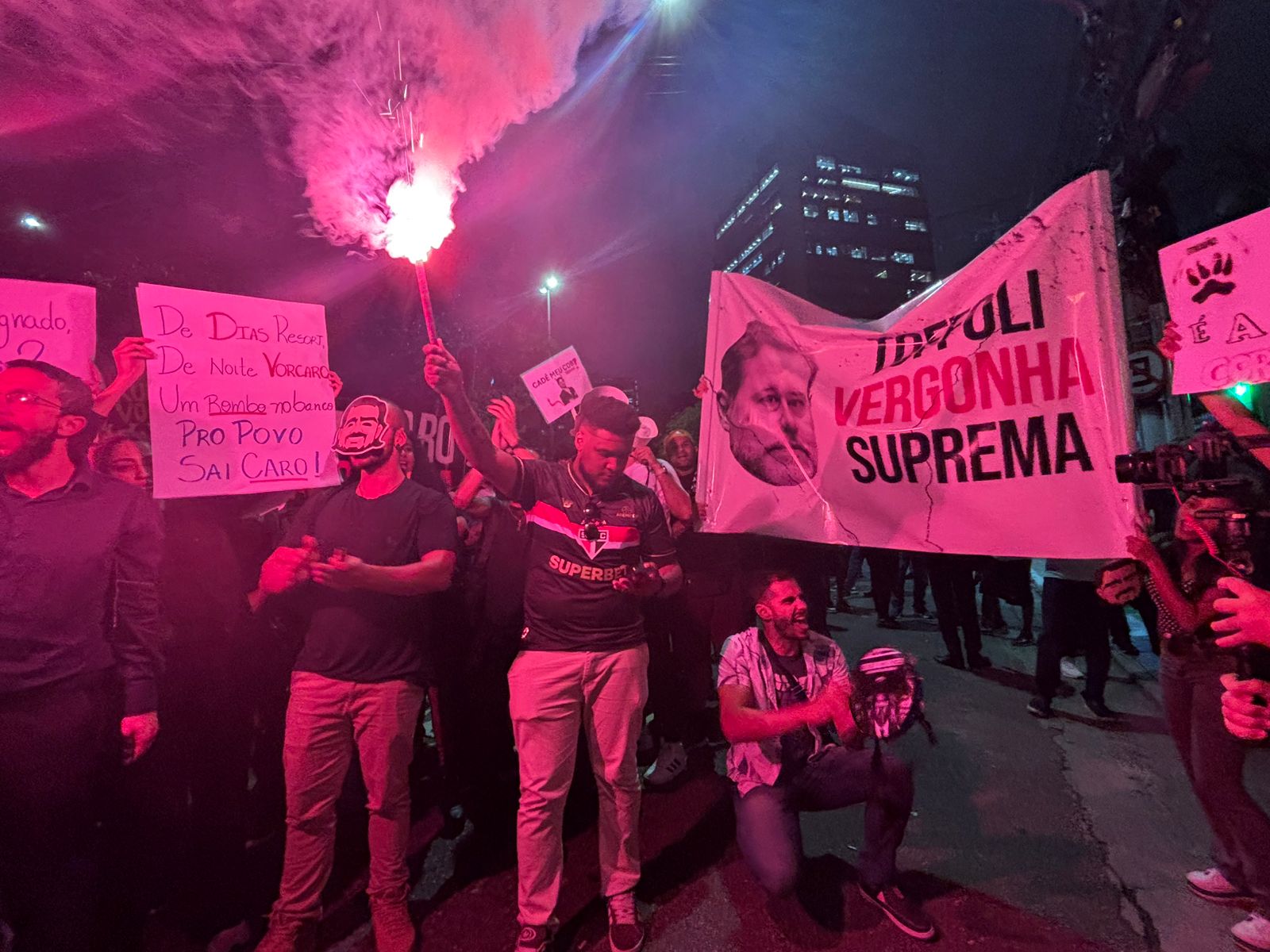 Durante a manifestação houve gritos pedindo o impeachment de Dias Toffoli, a prisão de Daniel Vorcaro e explicações ao ministro Alexandre de Moraes sobre os valores milionários recebidos por sua mulher em contratos relacionados ao Banco Master.