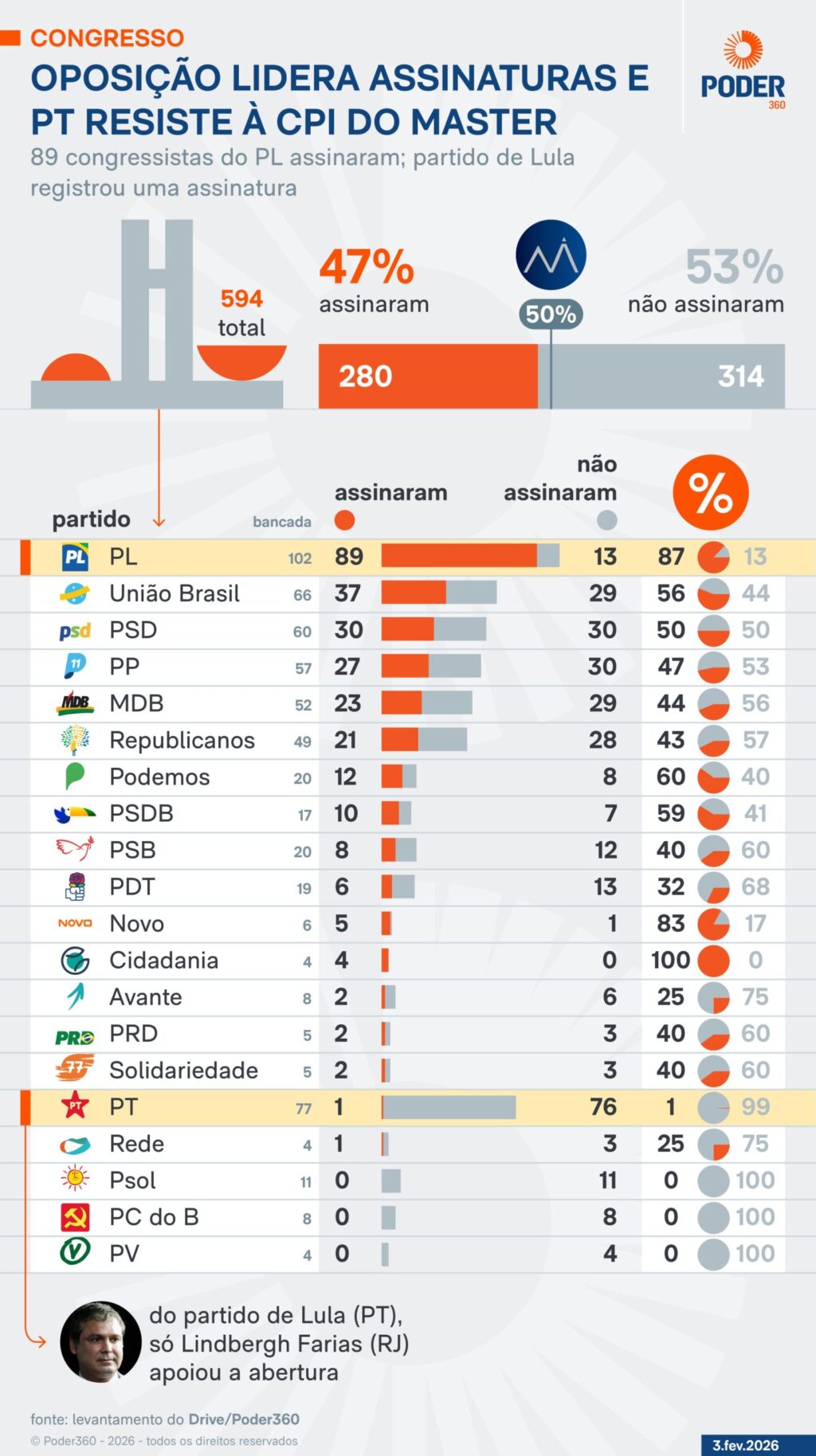 O ato foi realizado em um cenário de mobilização da oposição no Congresso para instalar uma CPI sobre o Banco Master. Como mostrou o Poder360, o requerimento já reúne assinaturas suficientes, mas enfrenta resistência do PT.