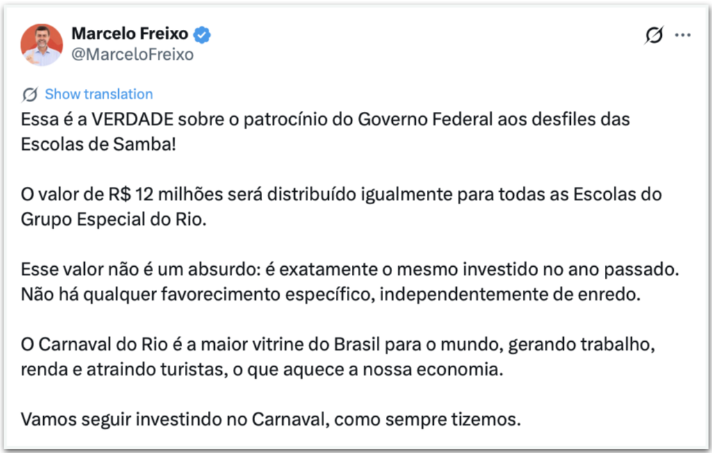 Em publicação no X na 6ª feira (6.fev), Freixo respondeu às acusações, afirmando que “o valor de R$ 12 milhões será distribuído igualmente para todas as Escolas do Grupo Especial do Rio”. Segundo o presidente da Embratur, o investimento no Carnaval da cidade é convertido em trabalho, renda e turismo.