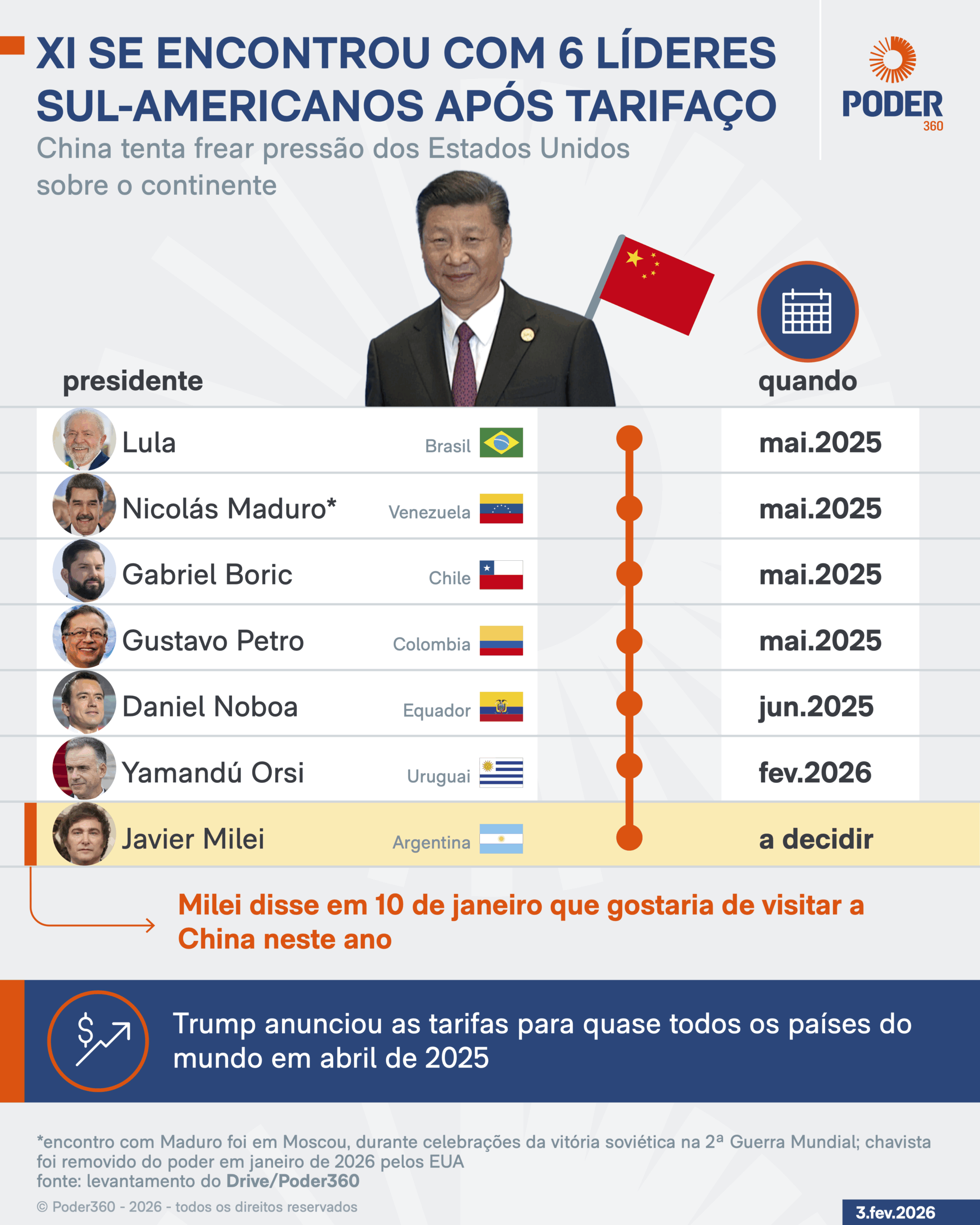Desde que o presidente dos Estados Unidos, Donald Trump (Partido Republicano), anunciou o “Dia da Libertação” em abril do ano passado –taxou mais de 180 países no mundo–, 6 líderes sul-americanos afetados pela política norte-americana conversaram pessoalmente com o presidente da China, Xi Jinping (Partido Comunista da China). O país asiático é o grande rival dos EUA no comércio global, e principalmente no continente sul-americano.