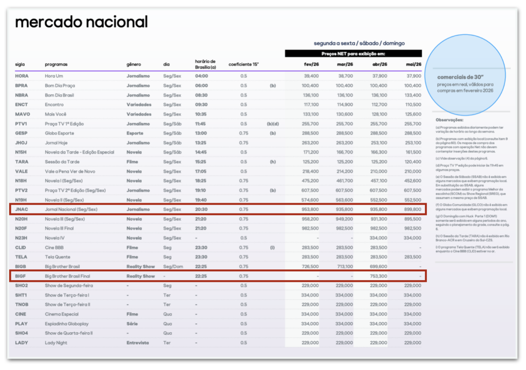 Em comparação com a mídia brasileira, uma inserção de 30 segundos no intervalo do “Jornal Nacional”, da TV Globo, custa R$ 953,8 mil, de acordo com a tabela de preços da emissora de fevereiro de 2026. Uma propaganda com o mesmo tempo na final do “BBB” custa um pouco menos: R$ 753,3 mil. Leia a íntegra (PDF – 9 MB).