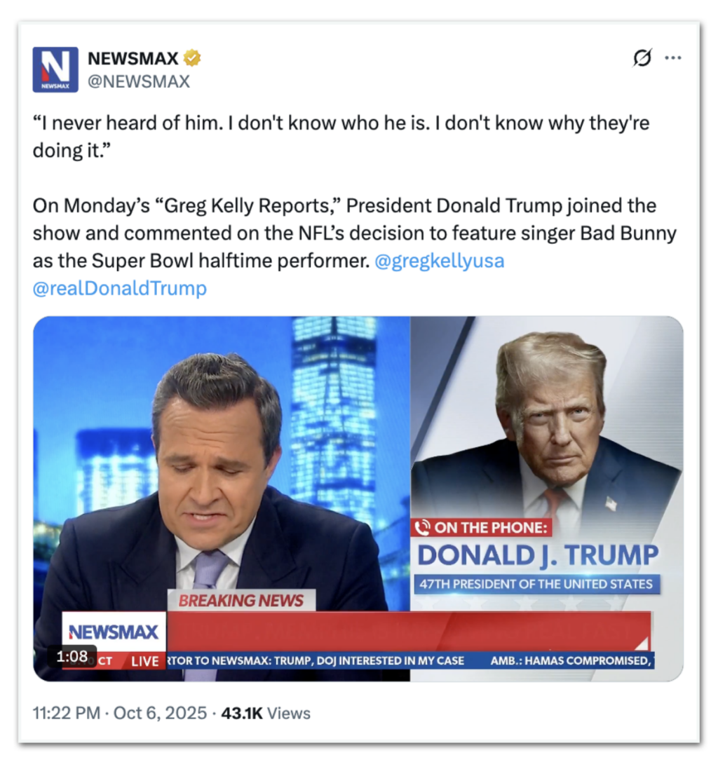 Em outubro de 2025, em entrevista ao programa Greg Kelly Reports da emissora Newsmax, o presidente norte-americano foi perguntado sobre o cantor. Respondeu que “nunca ouviu falar” de Bad Bunny ao comentar a decisão da NFL (National Football League) de convidá-lo para o show do intervalo: “Nunca ouvi falar dele. Não sei quem ele é. Não sei por que estão fazendo isso”, declarou.