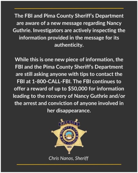 Na 6ª feira (6.fev), o FBI e o Departamento do Xerife do Condado de Pima informaram estar cientes de uma nova mensagem relacionada ao desaparecimento da idosa, cuja autenticidade está sendo verificada. As autoridades não confirmaram se essa comunicação e o possível pedido de resgate mencionado por Savannah estão conectados ou têm o mesmo remetente.