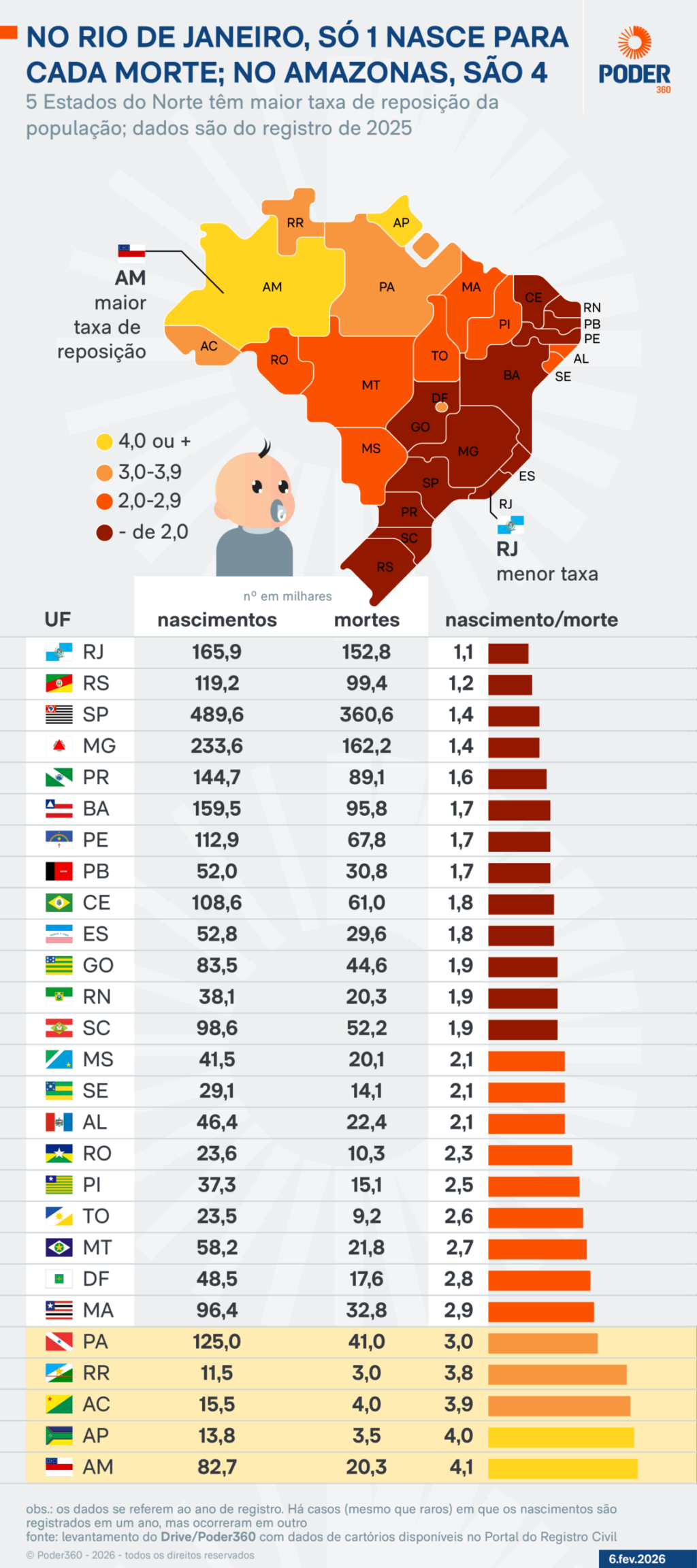 Os números dos infográficos acima são do Portal da Transparência do Registro Civil. Foram coletados pelo Poder360 em 30 de janeiro de 2026. É possível que haja revisões mínimas nos próximos dias e anos, mas o panorama geral de nascimentos e mortes apresentados nesta reportagem tende a não mudar.
