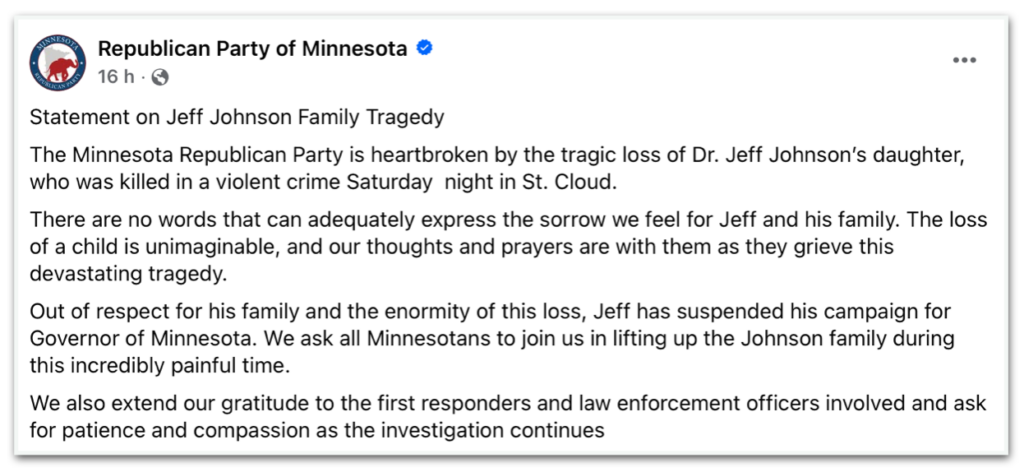 “Por respeito à sua família e à enormidade desta perda, Jeff suspendeu sua campanha para governador de Minnesota”, disse o Partido Republicano de Minnesota em publicado nas redes sociais na 2ª feira (9.fev).