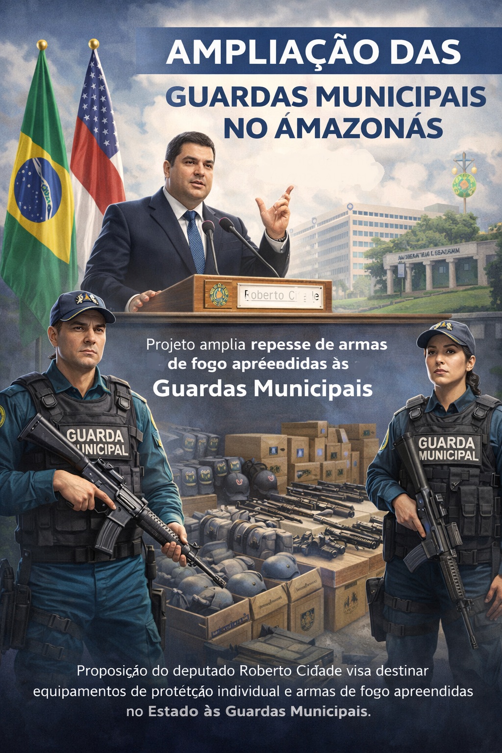 MANAUS – 10/02/2026 – Como forma de dar um direcionamento mais adequado aos armamentos de fogo e equipamentos de proteção individual de uso policial apreendidos no Estado, o (UB), presidente da Assembleia Legislativa do Amazonas (Aleam), apresentou o Projeto de Lei n° 04/2026, que destina esse material às Guardas Municipais que estejam legalmente instituídas.