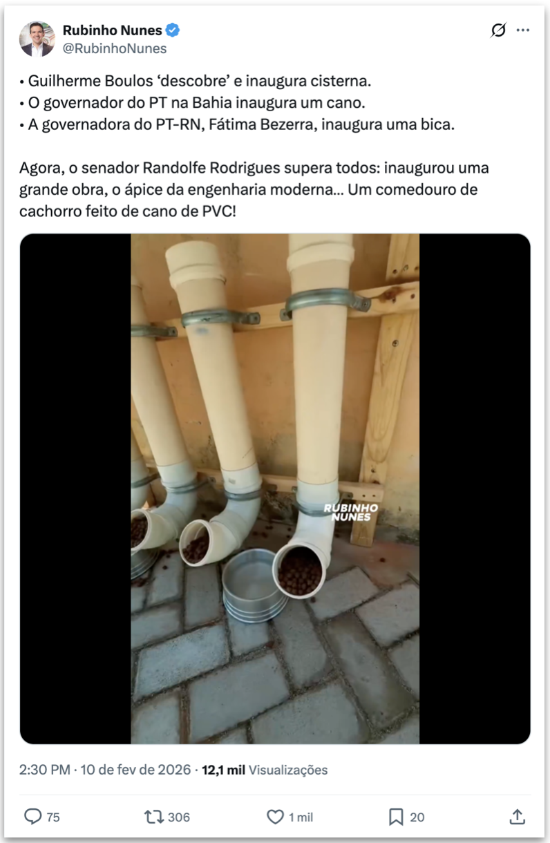 O vereador de São Paulo Rubinho Nunes (União-SP) publicou uma crítica no X e afirmou de forma irônica que o senador “inaugurou uma grande obra, o ápice da engenharia moderna… um comedouro de cachorro feito de cano de PVC!”.