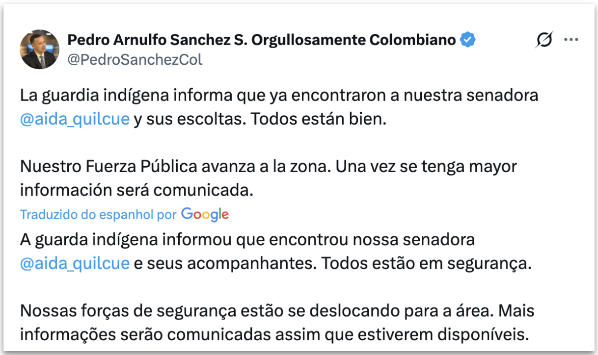 A senadora indígena colombiana Aida Quilcué (Movimento Alternativo Indígena e Social) foi sequestrada e posteriormente libertada nesta 3ª feira (10.fev.2026) no departamento de Cauca, no sudoeste da Colômbia. A congressista, importante liderança do povo Nasa e do CRIC (Consejo Regional Indígena del Cauca), perdeu comunicação com seus assessores por volta do meio-dia (no horário da Colômbia) e permaneceu em cativeiro por cerca de 4 horas. As informações são do jornal El País Colômbia.
